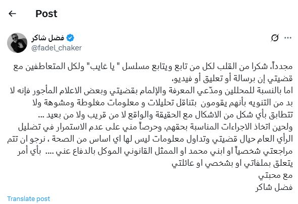 وتابع: لحين اتخاذ الإجراءات المناسبة بحقهم، وحرصًا مني على عدم الاستمرار في تضليل الرأي العام حيال قضيتي وتداول معلومات ليس لها أي أساس من الصحة، نرجو أن تتم مراجعتي شخصيًا أو ابني محمد أو الممثل القانوني الموكل بالدفاع عني بأي أمر يتعلق بملفاتي أو بشخصي أو عائلتي، مع محبتي".
