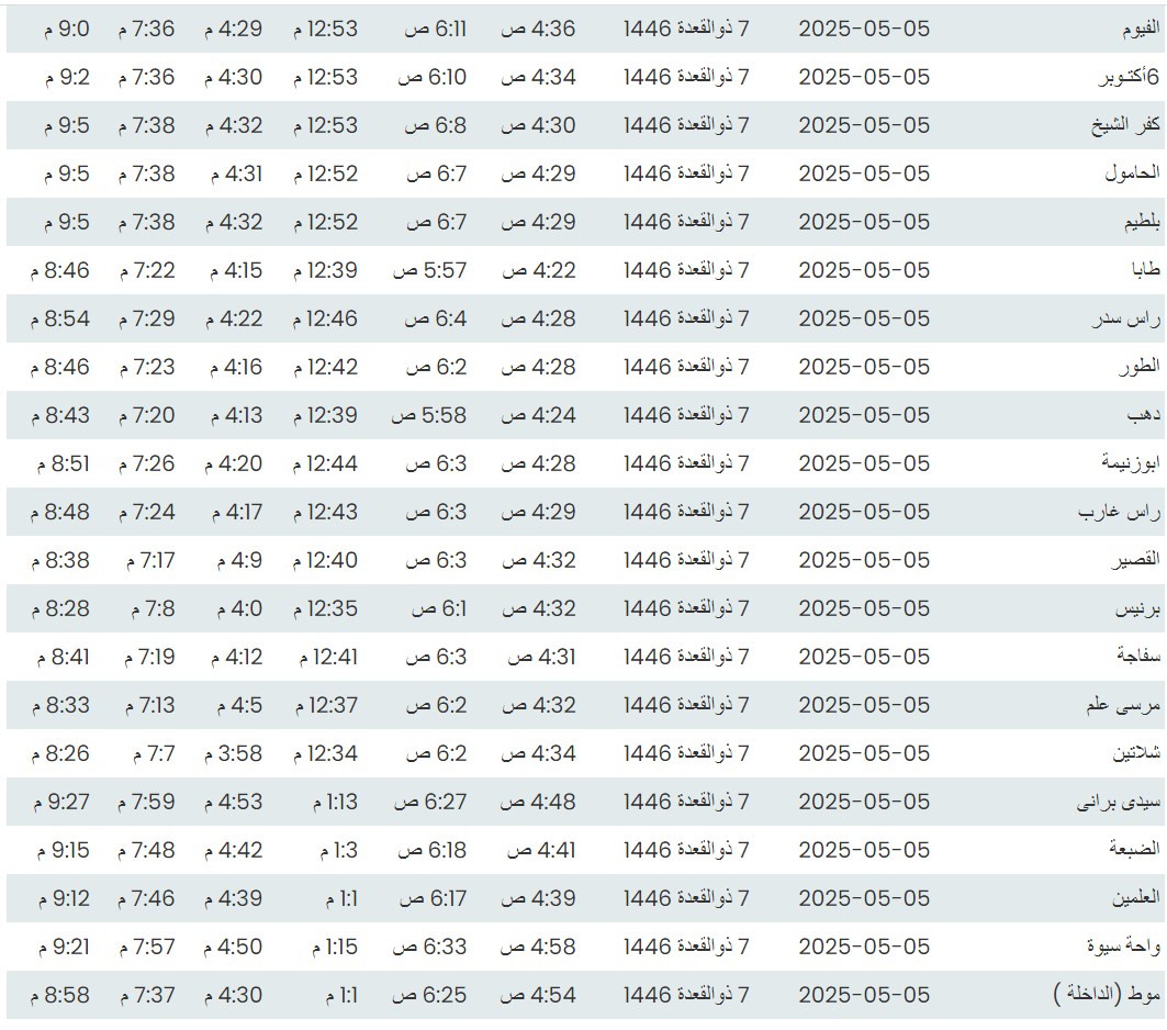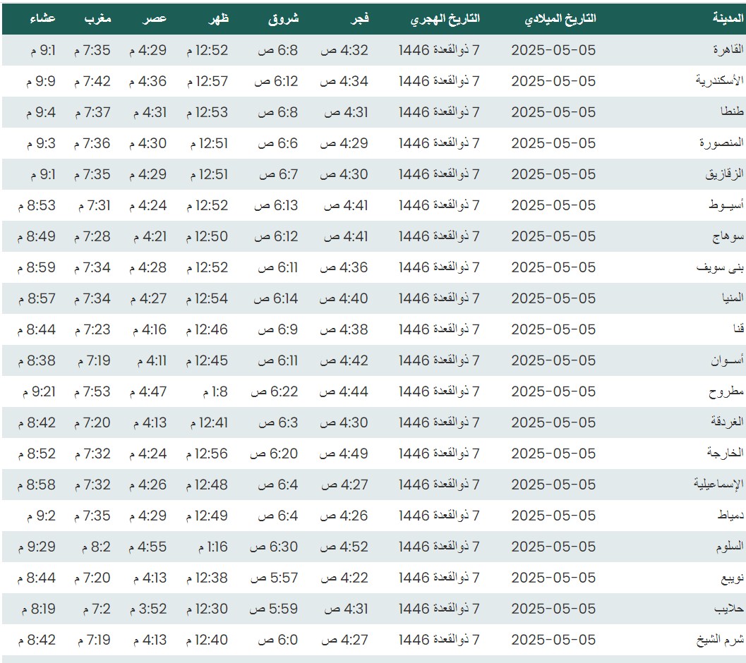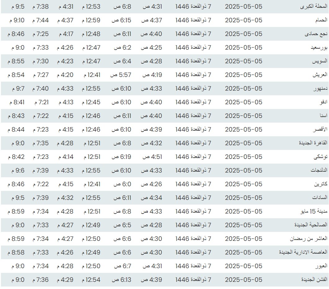 وفيما يلي مواقيت الصلاة، لعدد من مدن ومحافظات الجمهورية من واقع بيانات الهيئة العامة للمساحة