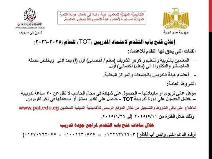 أعلنت الأكاديمية المهنية للمعلمين عن فتح باب التقدم لاعتماد المدربين ( T.O.T ) للعام 2025/2026م، وذلك للتقديم اعتبارا من 2025/5/11 على موقع الأكاديمية المهنية للمعلمين.