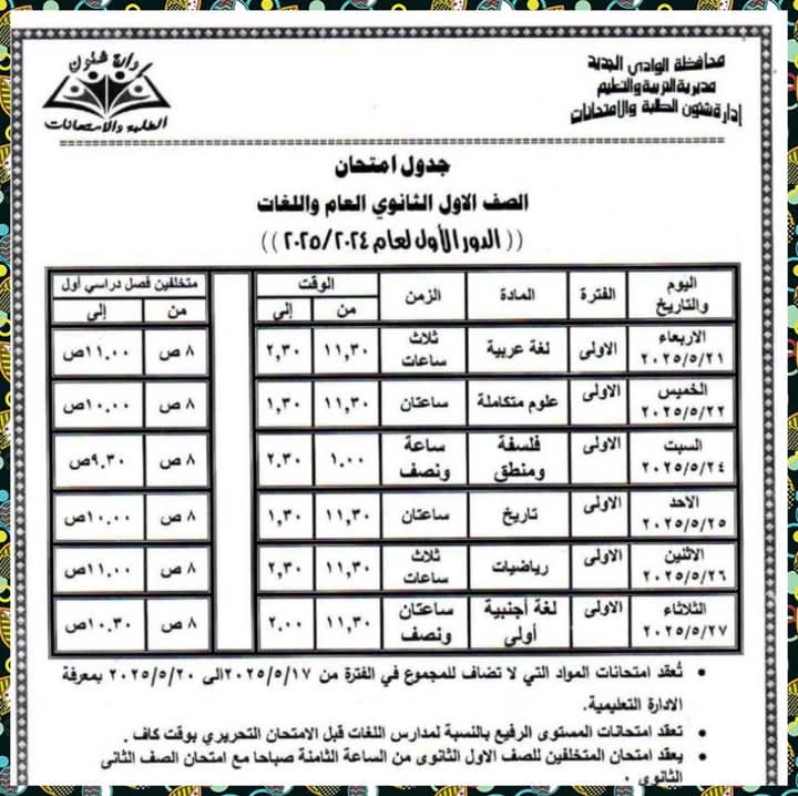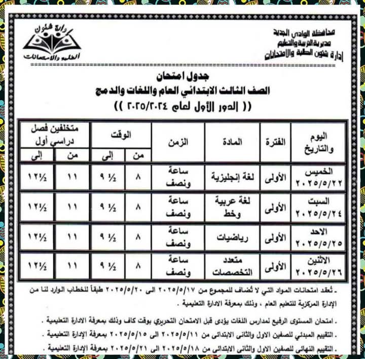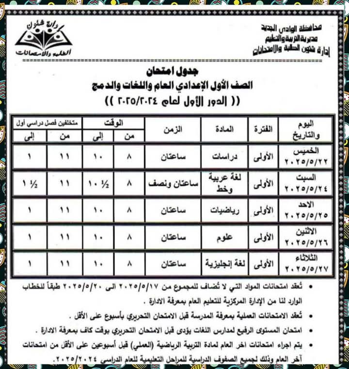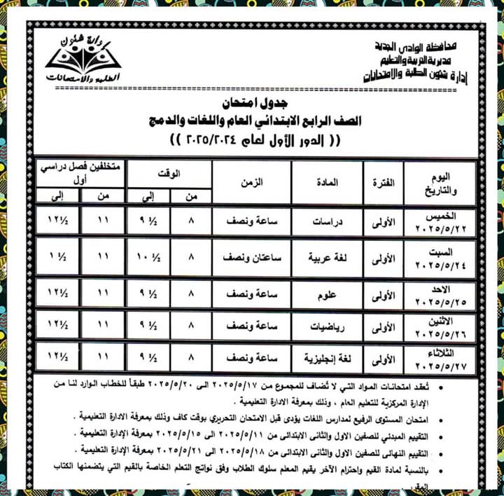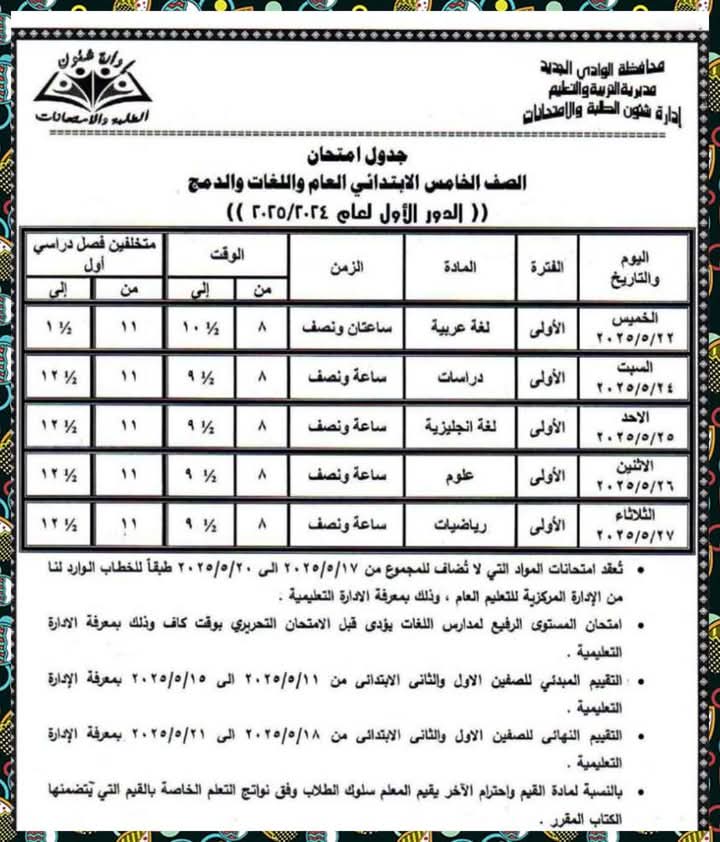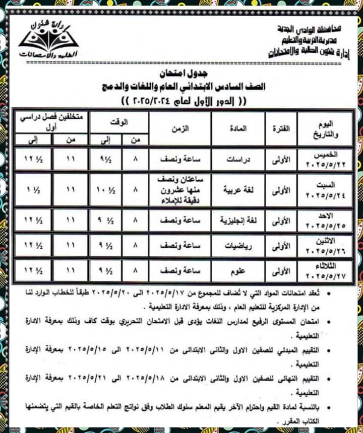 تعليم الوادي الجديد تنشر جداول امتحانات نهاية العام الدراسي