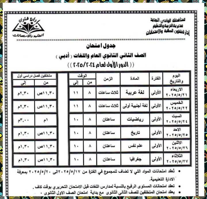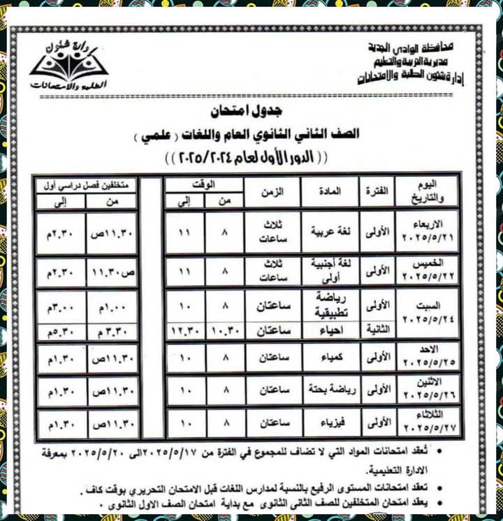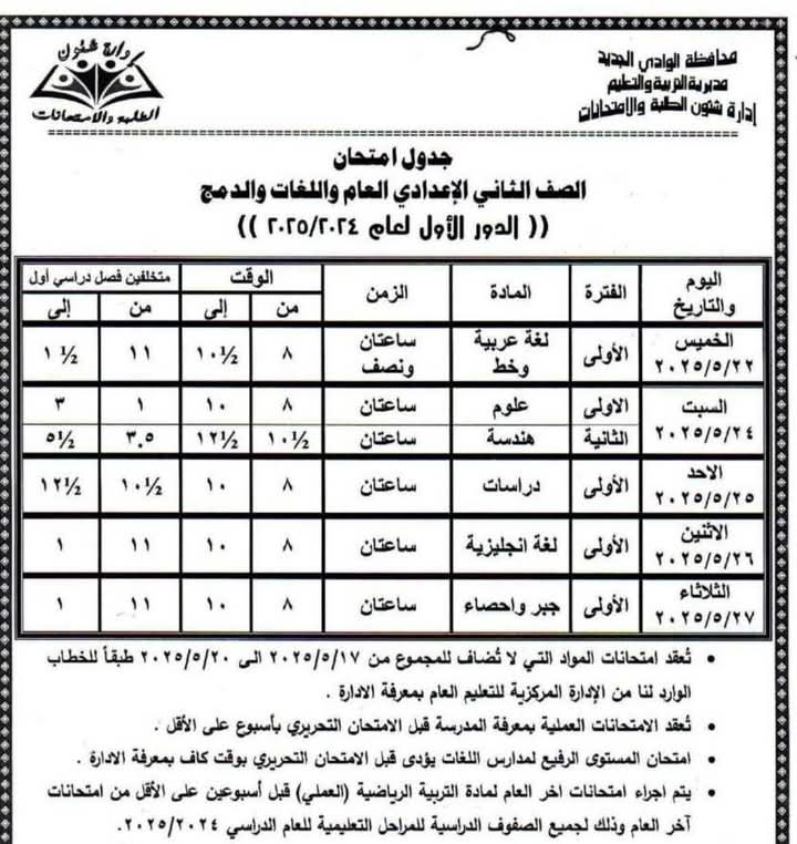 وقد اعتمد اللواء دكتور محمد الزملوط، محافظ الوادي الجديد، الجداول الزمنية لامتحانات الفصل الدراسي الثاني للعام الدراسي ٢٠٢٤ / ٢٠٢٥، تشمل كافة صفوف النقل بالمراحل التعليمية المختلفة (الابتدائية، الإعدادية، الثانوية العامة والفنية بأنواعها)، بالإضافة إلى الشهادة الإعدادية العامة والمهنية وفئات التربية الخاصة، وذلك على مستوى جميع الإدارات التعليمية الخمس بالمحافظة.