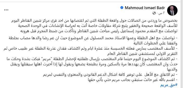 وقال"بدر": "بخصوص ما وردني من اتصالات حول واقعة الطفلة التي تم اغتصابها في إحدى قرى مركز شبين القناطر اليوم للأسف الواقعة صحيحة والخفير يتبع شركة مقاولات خاصة أتت به لحراسة الإنشاءات في الوحدة الصحية".