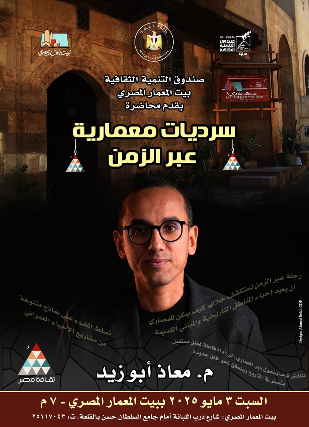 يواصل بيت المعمار المصري التابع لـ قطاع صندوق التنمية الثقافية برئاسة المعماري حمدي السطوحي، أنشطته الهادفة إلى تعميق الوعي بالتراث المعماري وتاريخه، حيث ينظم مساء السبت الموافق 3 مايو، في تمام الساعة السابعة مساءً، محاضرة بعنوان "سرديات معمارية عبر الزمن"، بمقره الكائن بشارع درب اللبانة أمام جامع السلطان حسن.