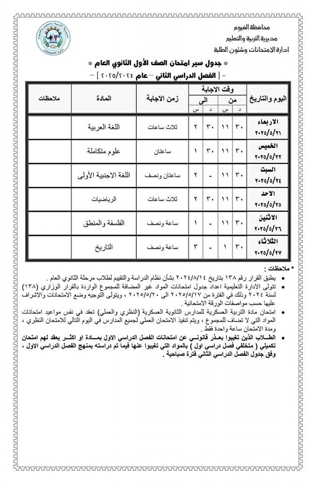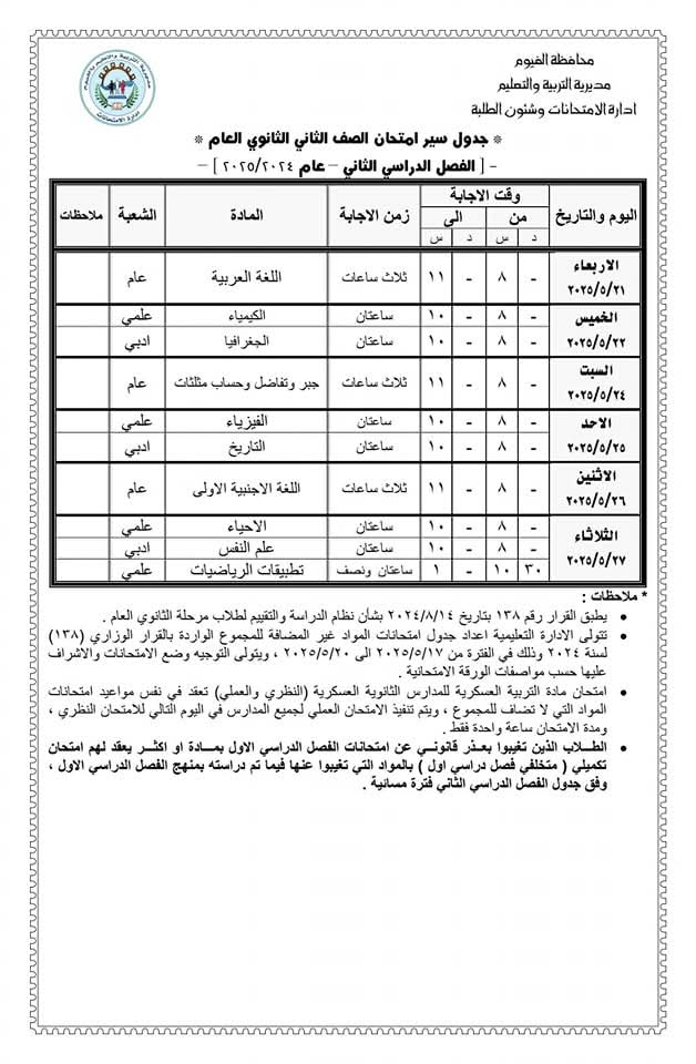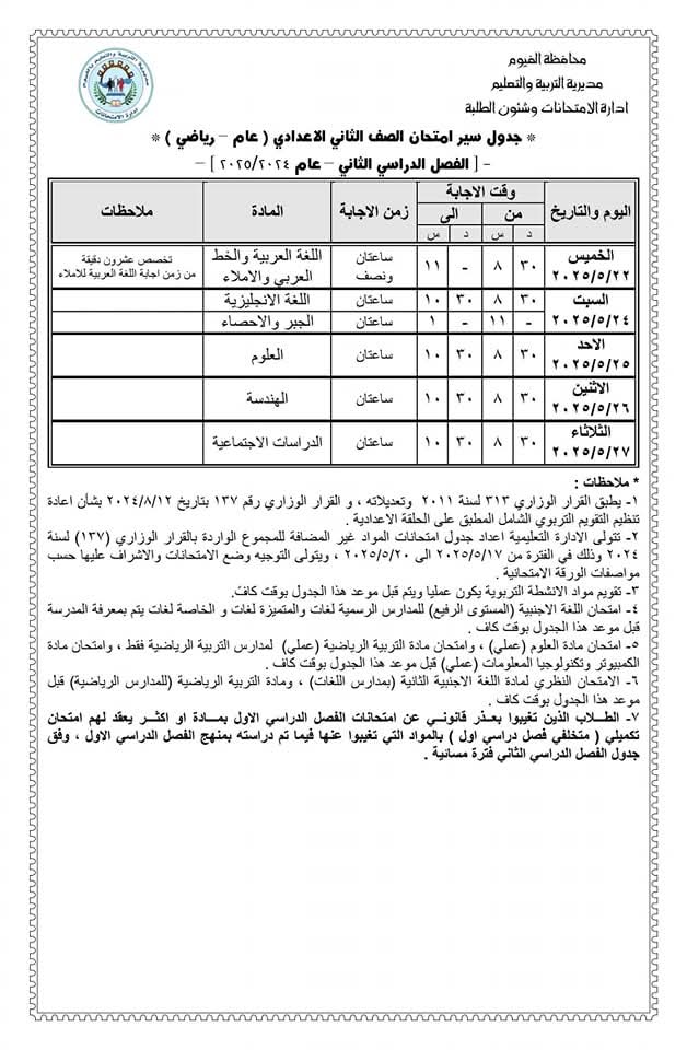 محافظ الفيوم يعتمد جداول امتحانات الفصل الدراسي الثاني لصفوف النقل والشهادة الإعدادية