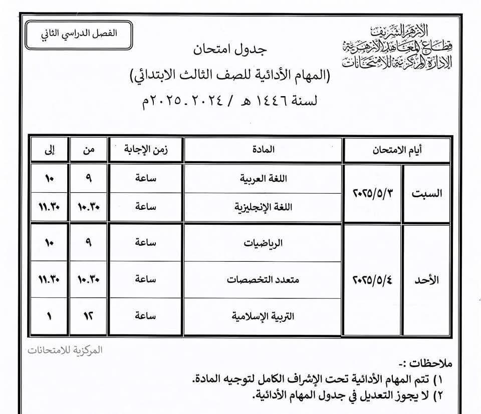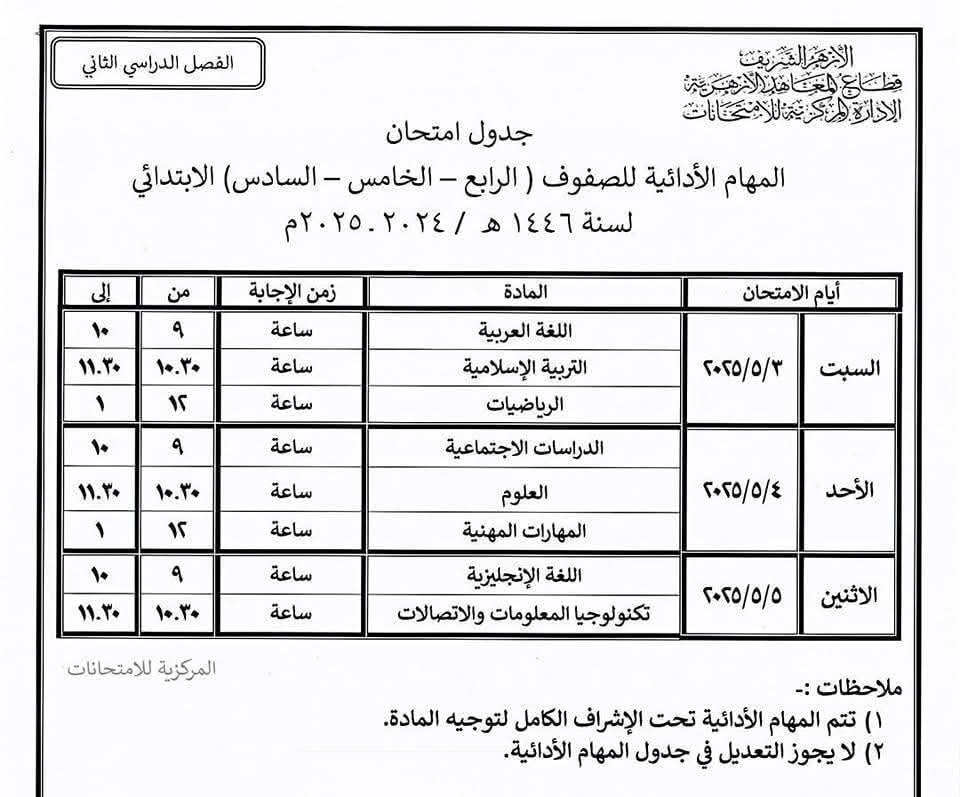 تبدأ اليوم السبت الموافق 3 مايو 2025، امتحانات المهام الأدائية للفصل الدراسي الثاني لطلاب المرحلة الابتدائية الأزهرية بمنطقة الجيزة، والتي تشمل الصفوف من الثالث وحتى السادس الابتدائي.