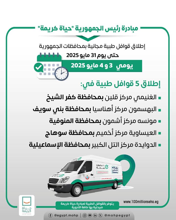 أعلنت وزارة الصحة والسكان عن إطلاق ٥ قوافل طبية ضمن مبادرة رئيس الجمهورية حياة كريمة، يومي ٣ و٤ مايو ٢٠٢٥ للكشف والعلاج مجانًا.