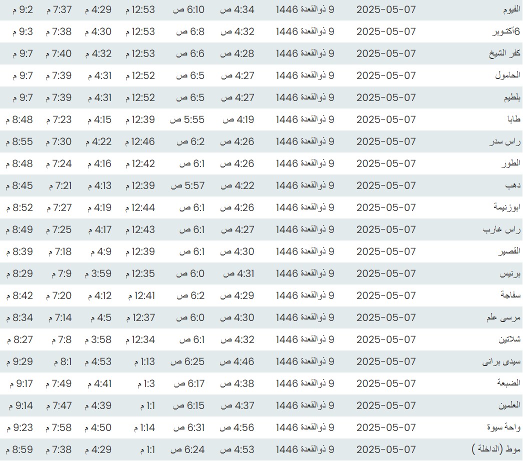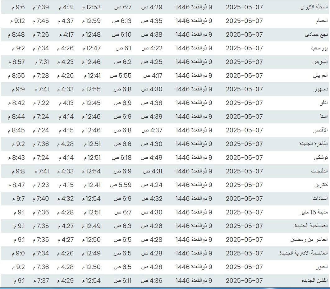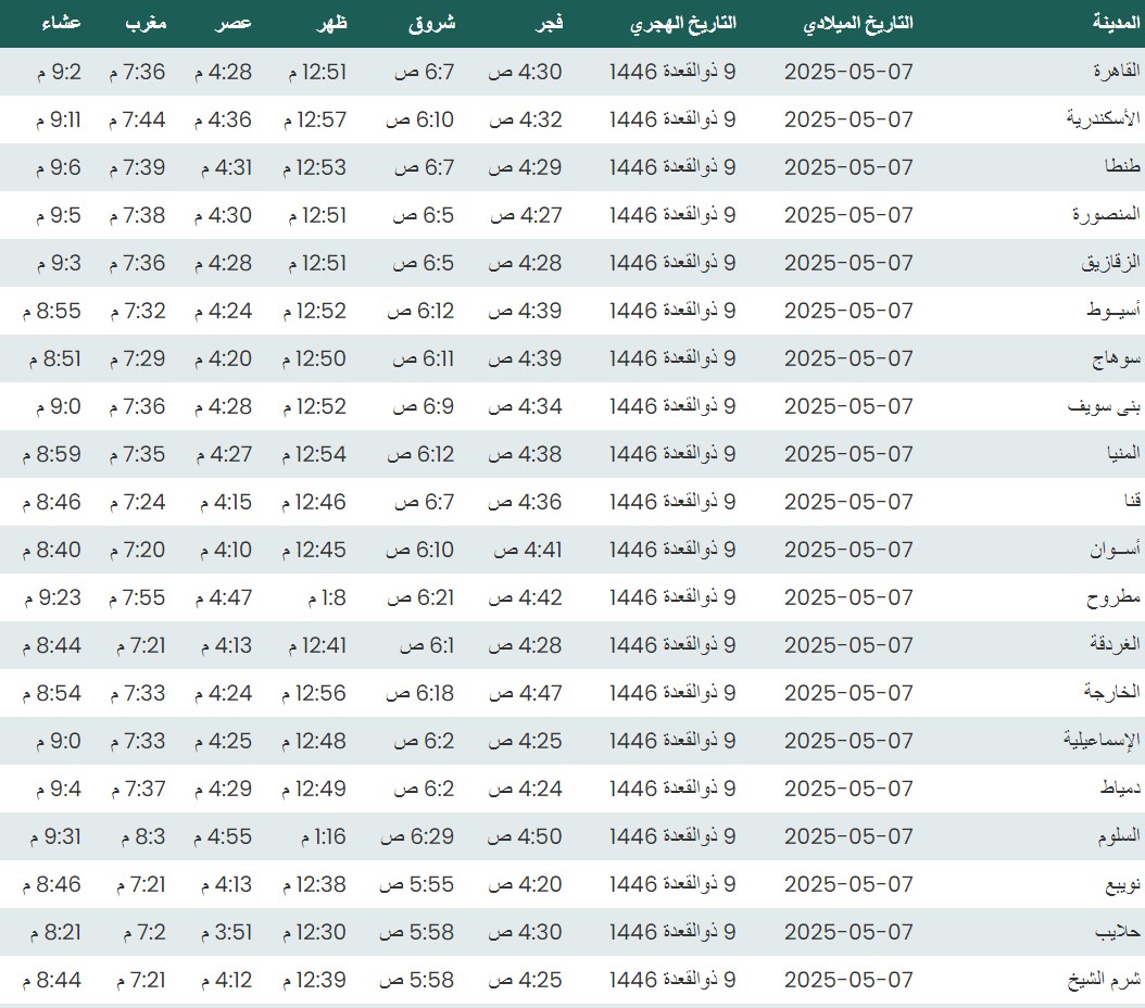 وفيما يلي مواقيت الصلاة، لعدد من مدن ومحافظات الجمهورية من واقع بيانات الهيئة العامة للمساحة