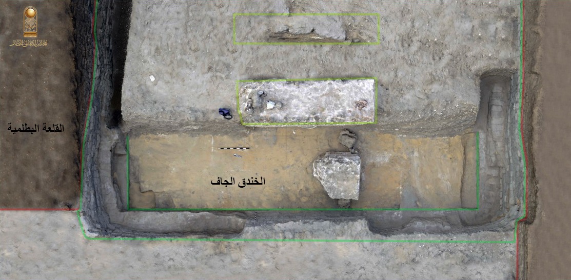 وأضاف أن البعثة استطاعت الكشف عن تصميم معماري مميز للبوابتين الشرقية للقلعتين البطلمية والرومانية المكتشفتين من قبل بالموقع، مما يساعد في إعادة تصور شكل المداخل الدفاعية في ذلك الوقت، بالإضافة إلى خندق دفاعي ضخم بعمق يزيد على مترين عند مدخل القلعة البطلمية، يُعتقد أنه كان جزءًا من نظام دفاعي يمكن تعطيله عند التهديد.