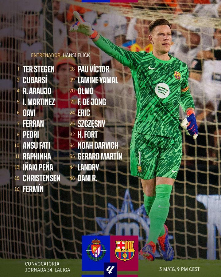 الدوري الإسباني، أعلن هانز فليك مدرب فريق برشلونة قائمة فريقه لمواجهة بلد الوليد، اليوم السبت، في إطار مواجهات الجولة الرابعة والثلاثين لبطولة الدوري الإسباني "الليجا".