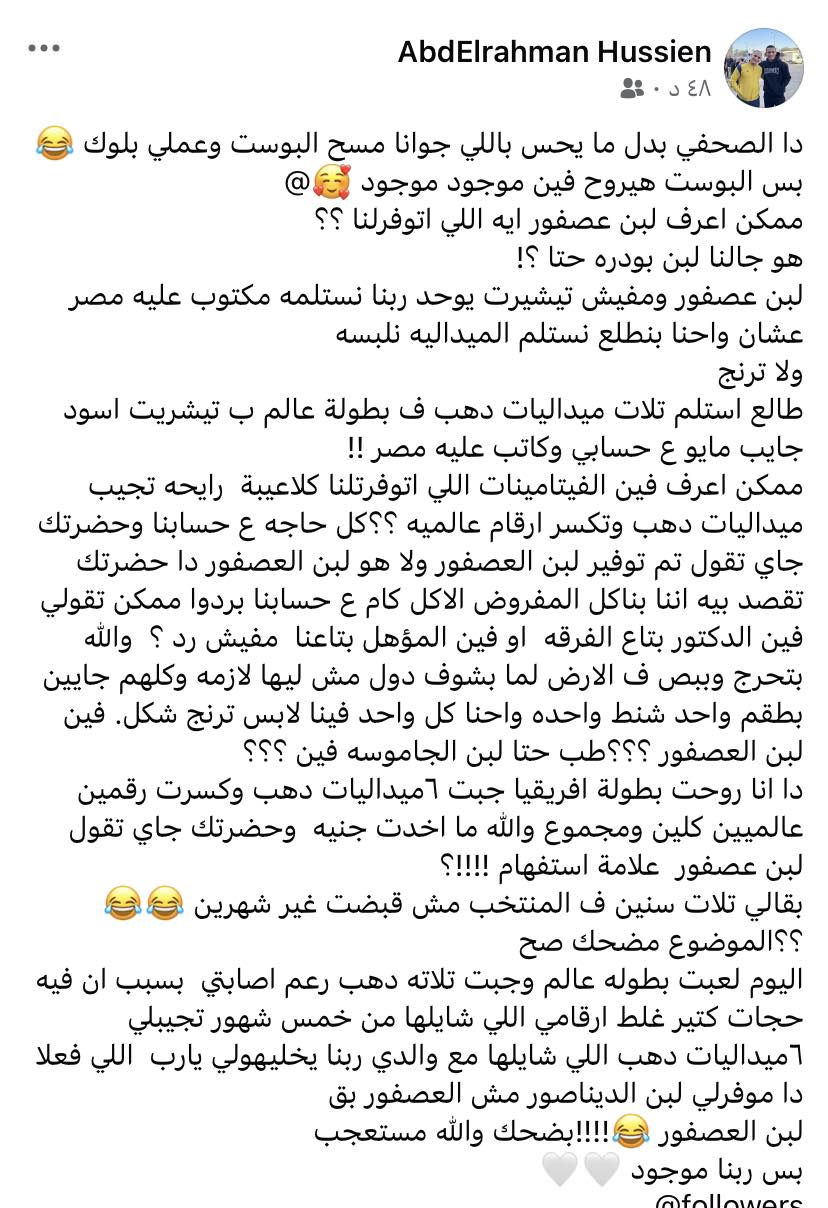 وأوضح اللاعب، أنه تسلم ميداليات بطولة العالم مرتديا تي شيرت أسود قام بشرائه من ماله الخاص، وأن الاتحاد لم يقم بتوفير أبسط الأشياء وهي الملابس.