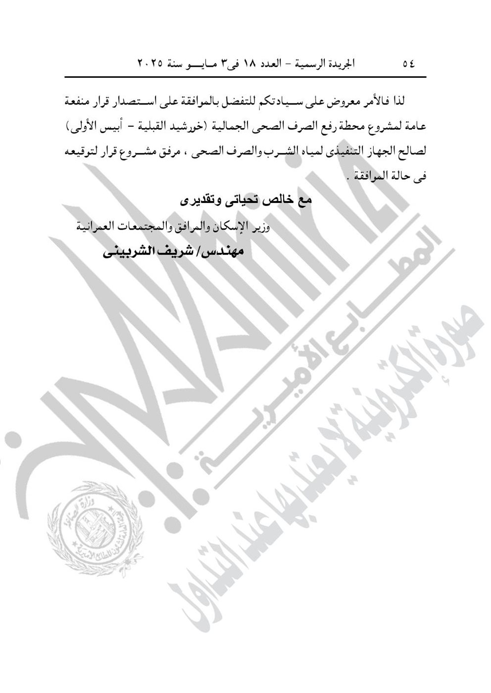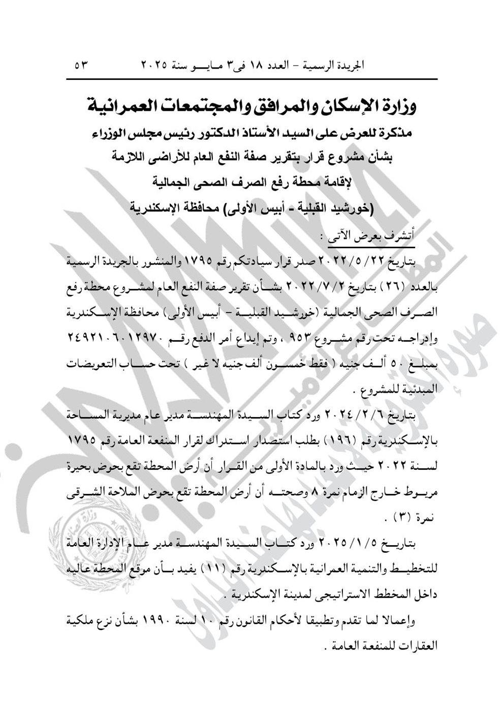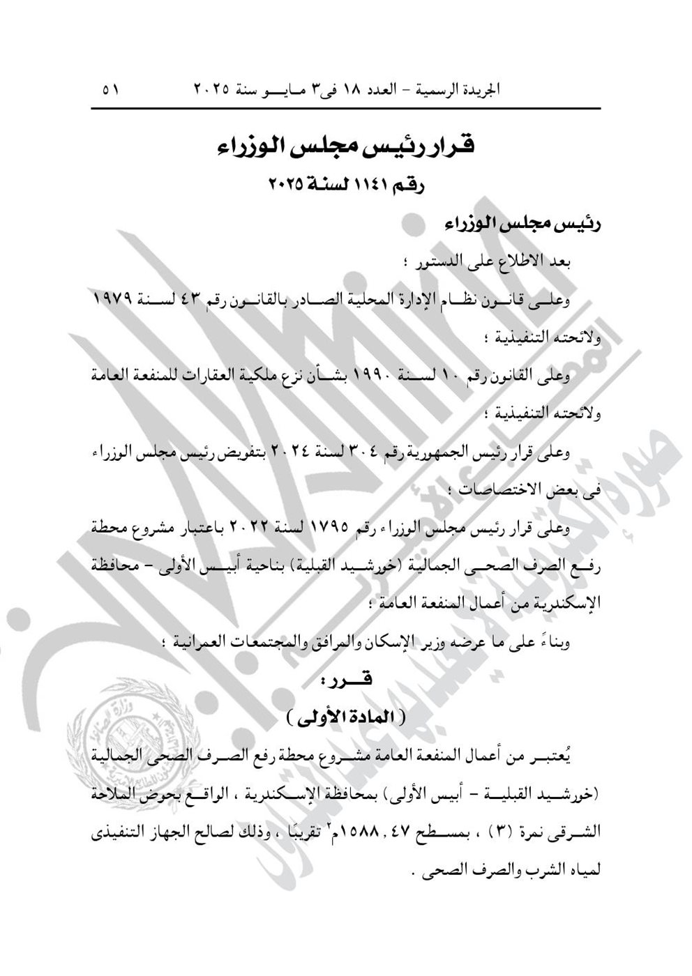 - قرار رئيس مجلس الوزراء رقم 1141 لسنة 2025، بشأن اعتبار مشروع محطة رفع الصرف الصحى الجمالية خورشيد القبلية- أبيس الأولى، بمحافظة الإسكندرية، الواقع بحوض الملاحة الشرقي نمرة (3)، بمسطح 47.1588 متر مربع، من أعمال المنفعة العامة، وذلك لصالح الجهاز التنفيذى لمياه الشرب والصرف الصحي، ويستولى بطريق التنفيذ المباشر على الأراضى اللازمة لتنفيذ المشروع.