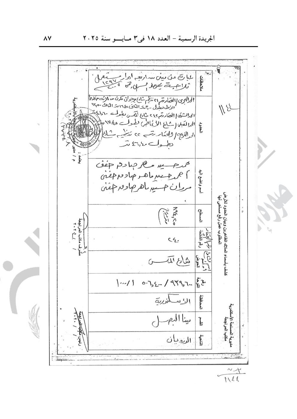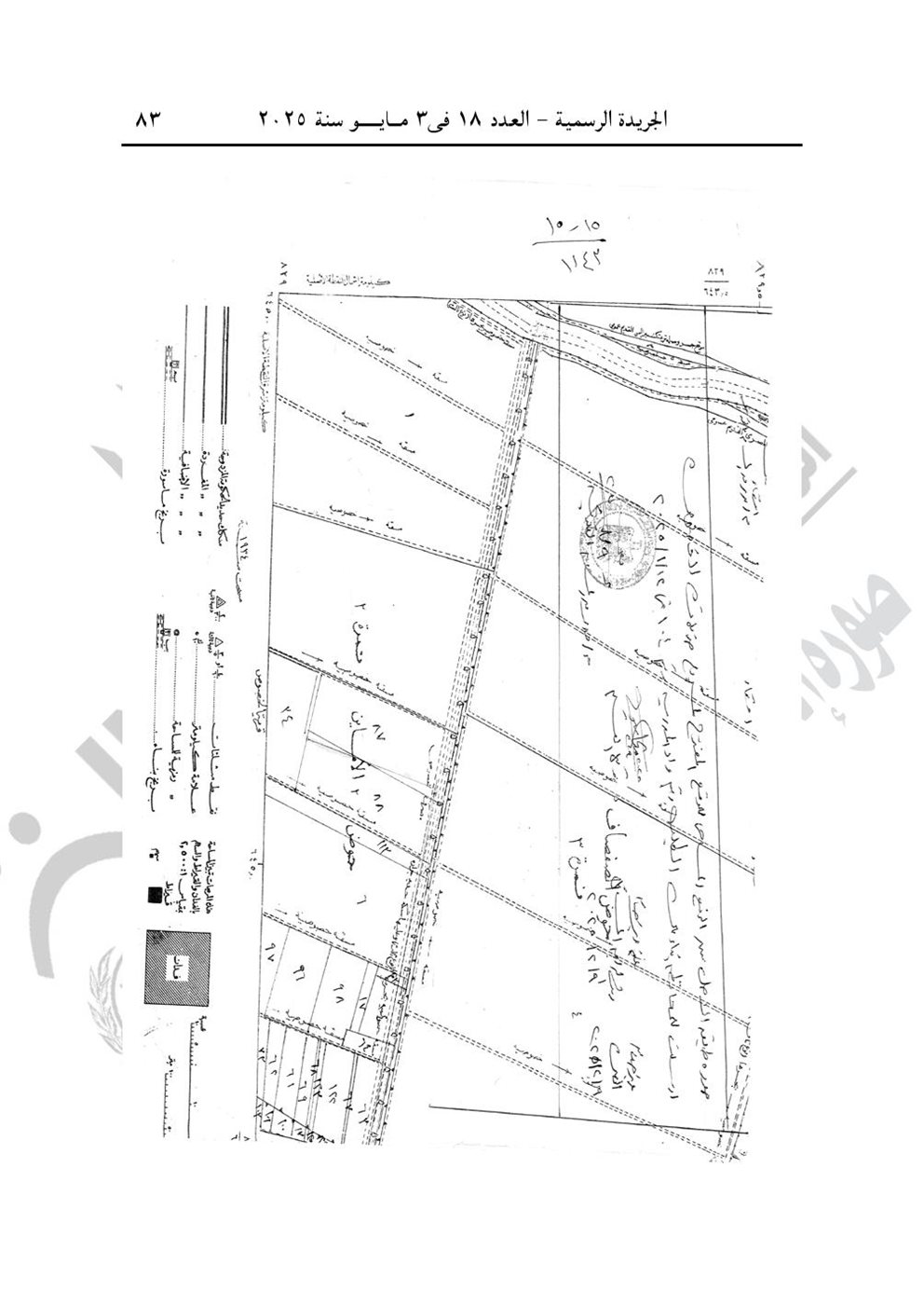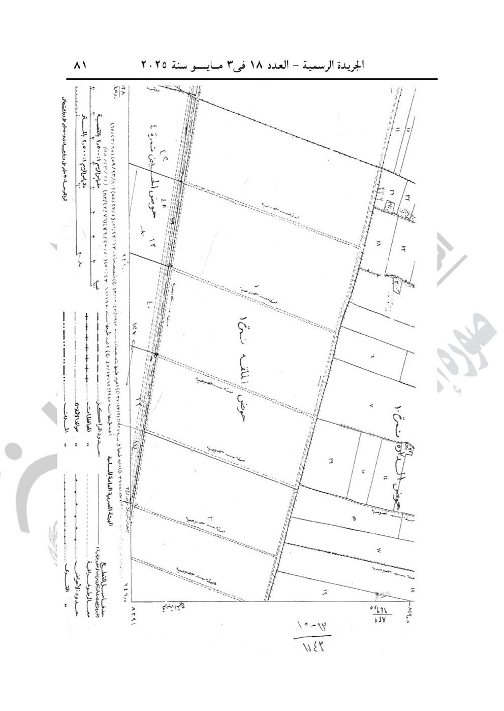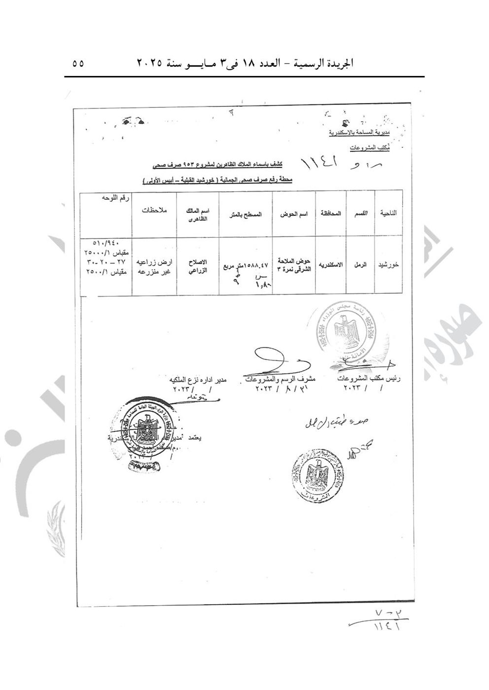 - قرار رئيس مجلس الوزراء رقم 1141 لسنة 2025، بشأن اعتبار مشروع محطة رفع الصرف الصحى الجمالية خورشيد القبلية- أبيس الأولى، بمحافظة الإسكندرية، الواقع بحوض الملاحة الشرقي نمرة (3)، بمسطح 47.1588 متر مربع، من أعمال المنفعة العامة، وذلك لصالح الجهاز التنفيذى لمياه الشرب والصرف الصحي، ويستولى بطريق التنفيذ المباشر على الأراضى اللازمة لتنفيذ المشروع.