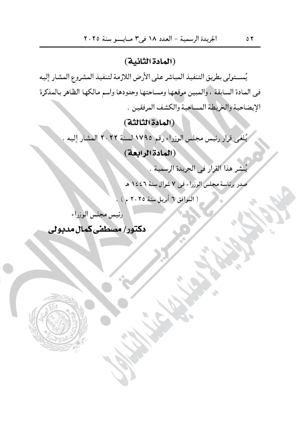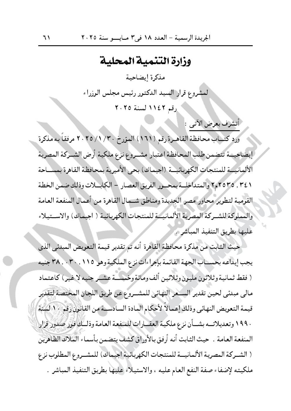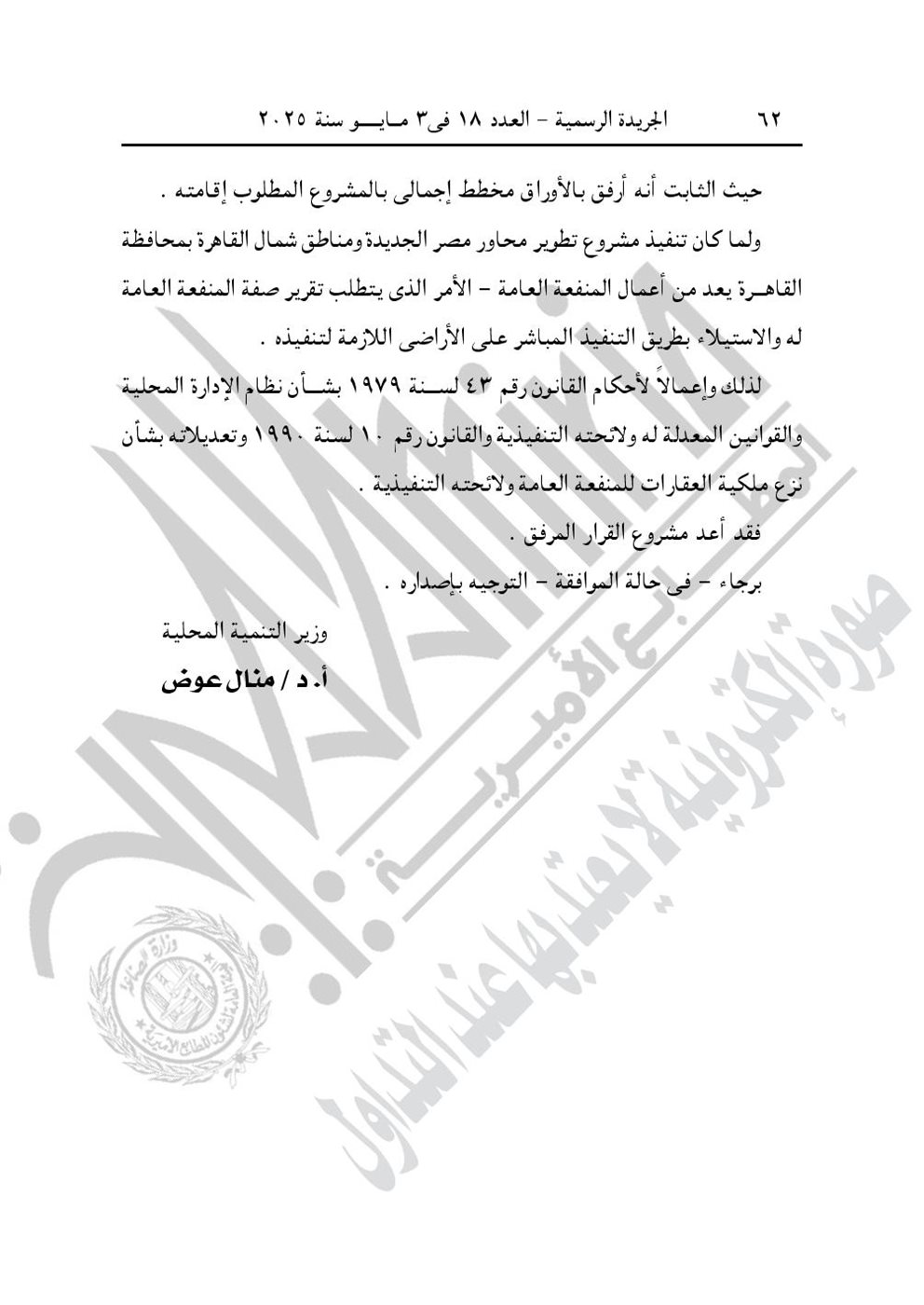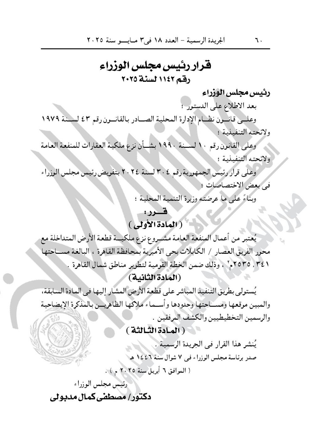 -وقرار رئيس مجلس الوزراء رقم 1142 لسنة 2025، بشأن اعتبار مشروع نزع ملكية قطعة الأرض المتداخلة مع محور الفريق العصار/ الكابلات بحي الأميرية بمحافظة القاهرة، البالغة مساحتها 2535.341 متر مربع، ضمن الخطة القومية لتطوير مناطق شمال القاهرة، من أعمال المنفعة العامة، ويستولى بطريق التنفيذ المباشر على الأراضى اللازمة لتنفيذ المشروع.