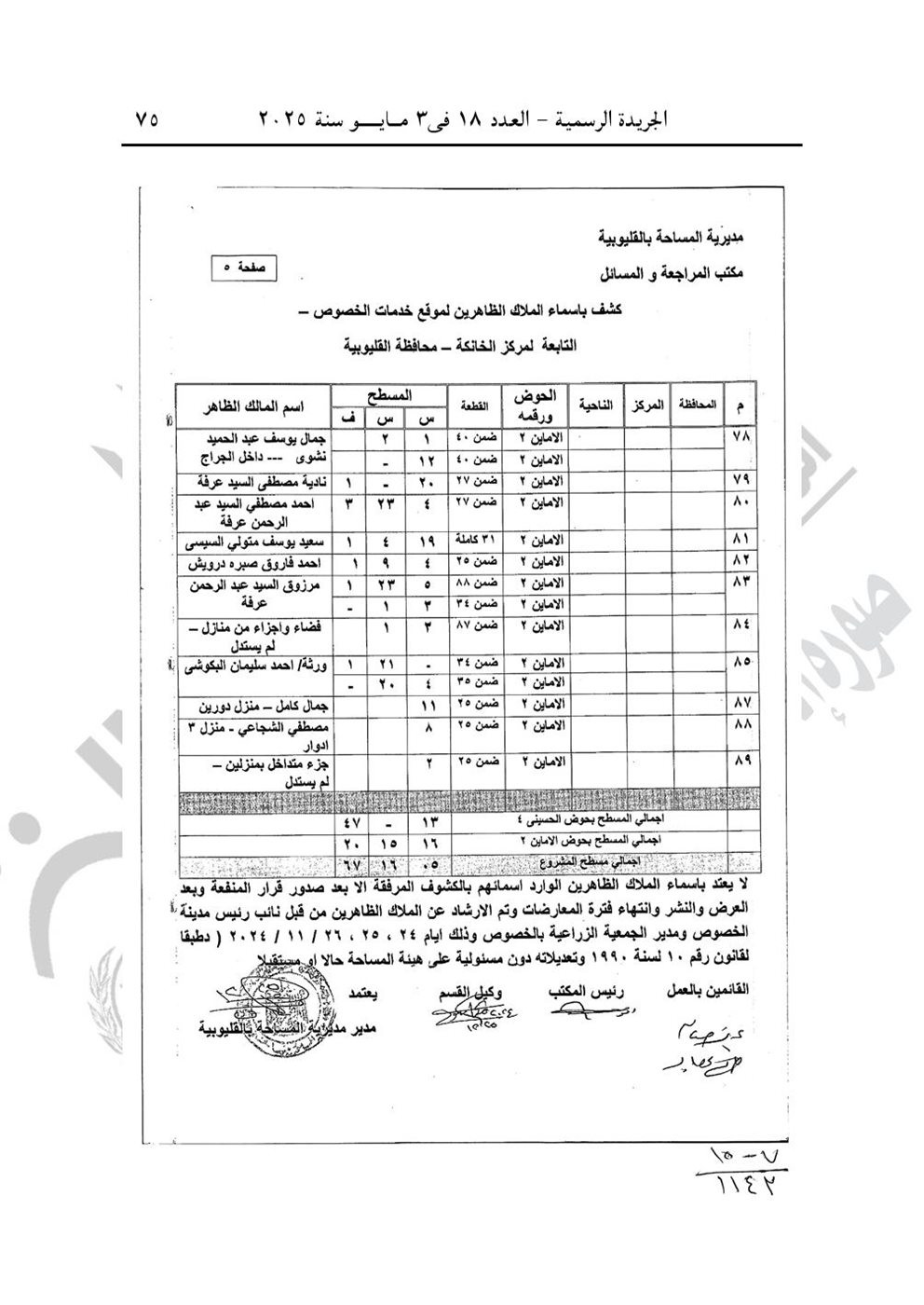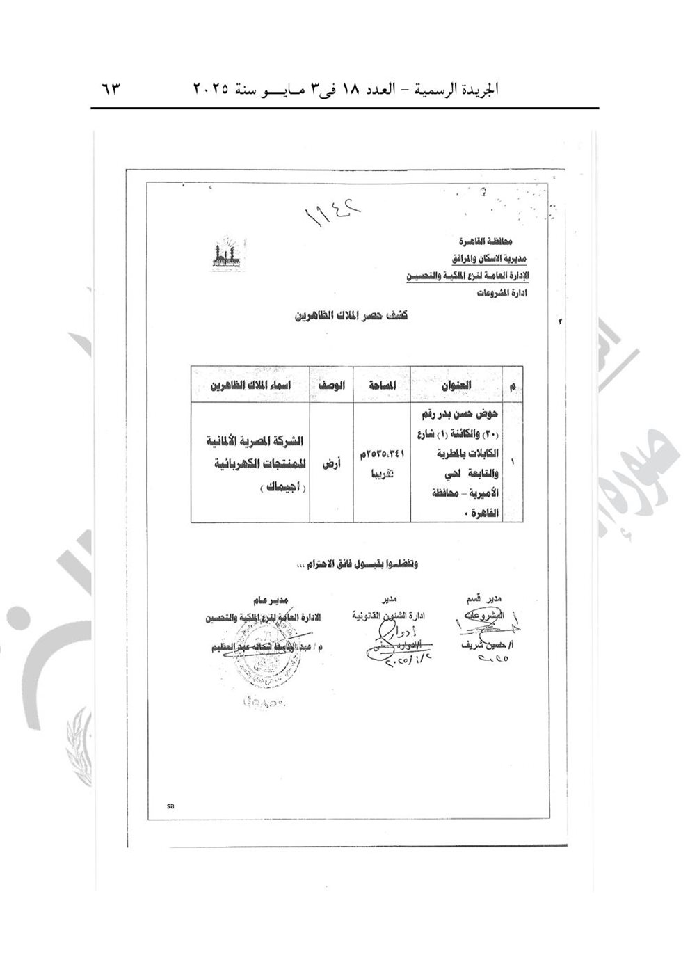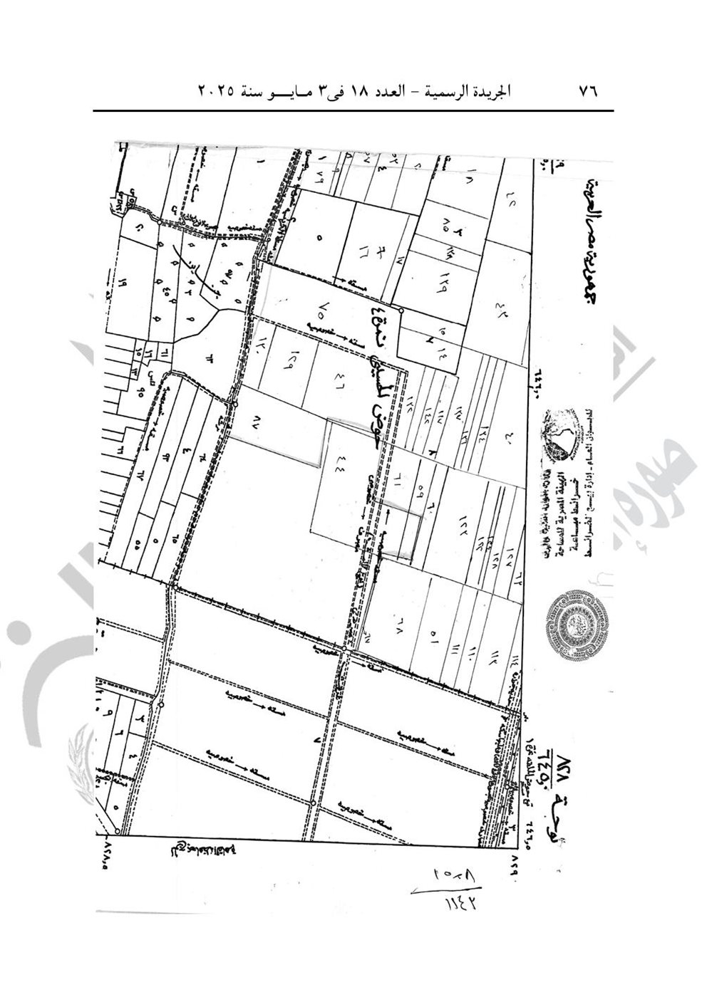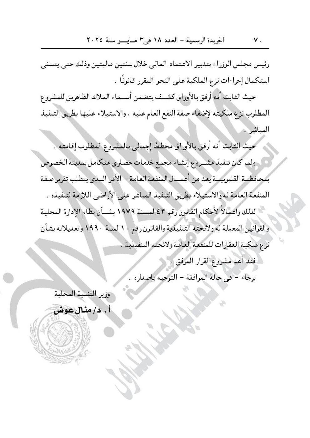 -وقرار رئيس مجلس الوزراء رقم 1142 لسنة 2025، بشأن اعتبار مشروع نزع ملكية قطعة الأرض المتداخلة مع محور الفريق العصار/ الكابلات بحي الأميرية بمحافظة القاهرة، البالغة مساحتها 2535.341 متر مربع، ضمن الخطة القومية لتطوير مناطق شمال القاهرة، من أعمال المنفعة العامة، ويستولى بطريق التنفيذ المباشر على الأراضى اللازمة لتنفيذ المشروع.