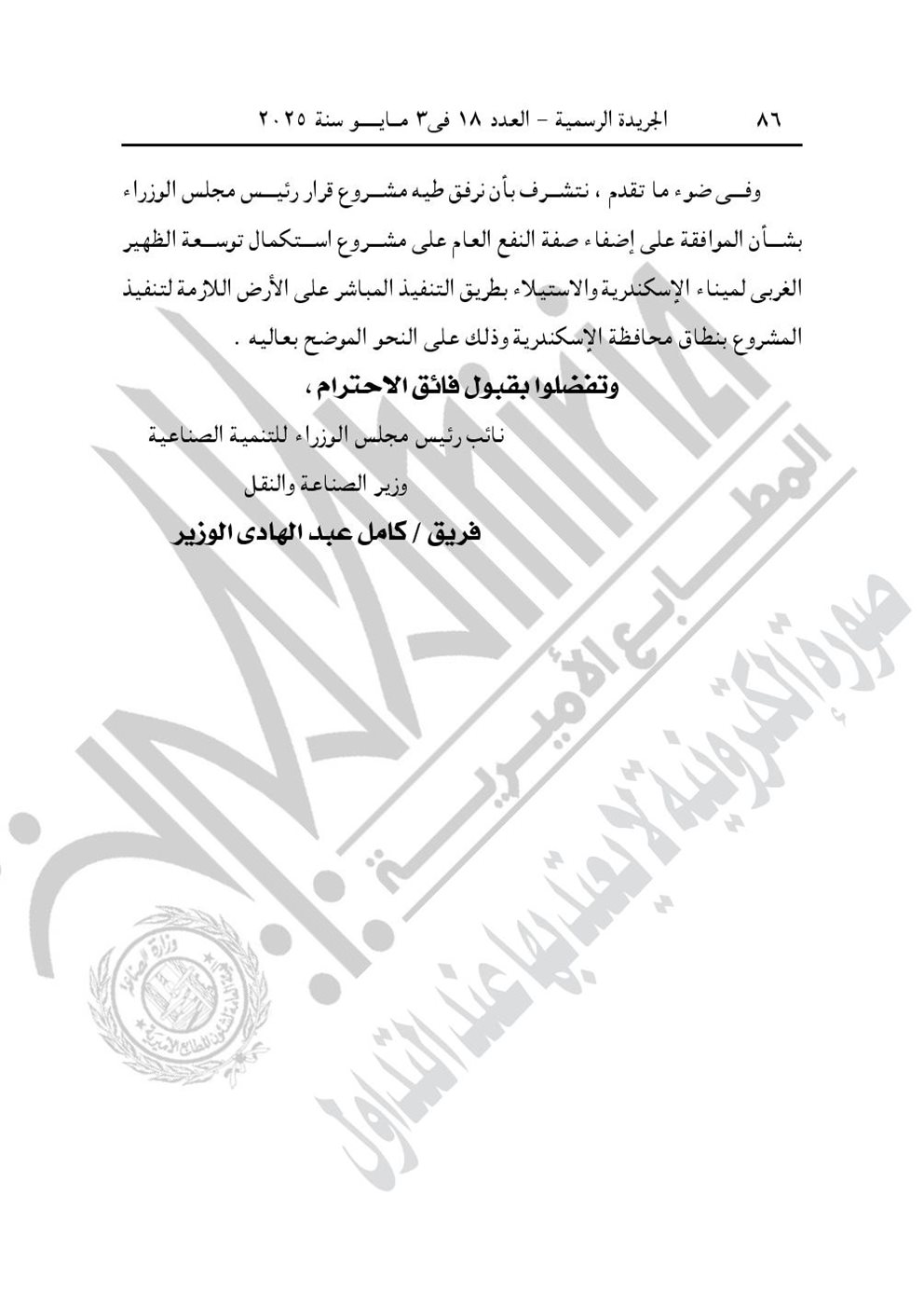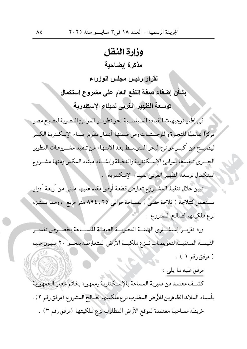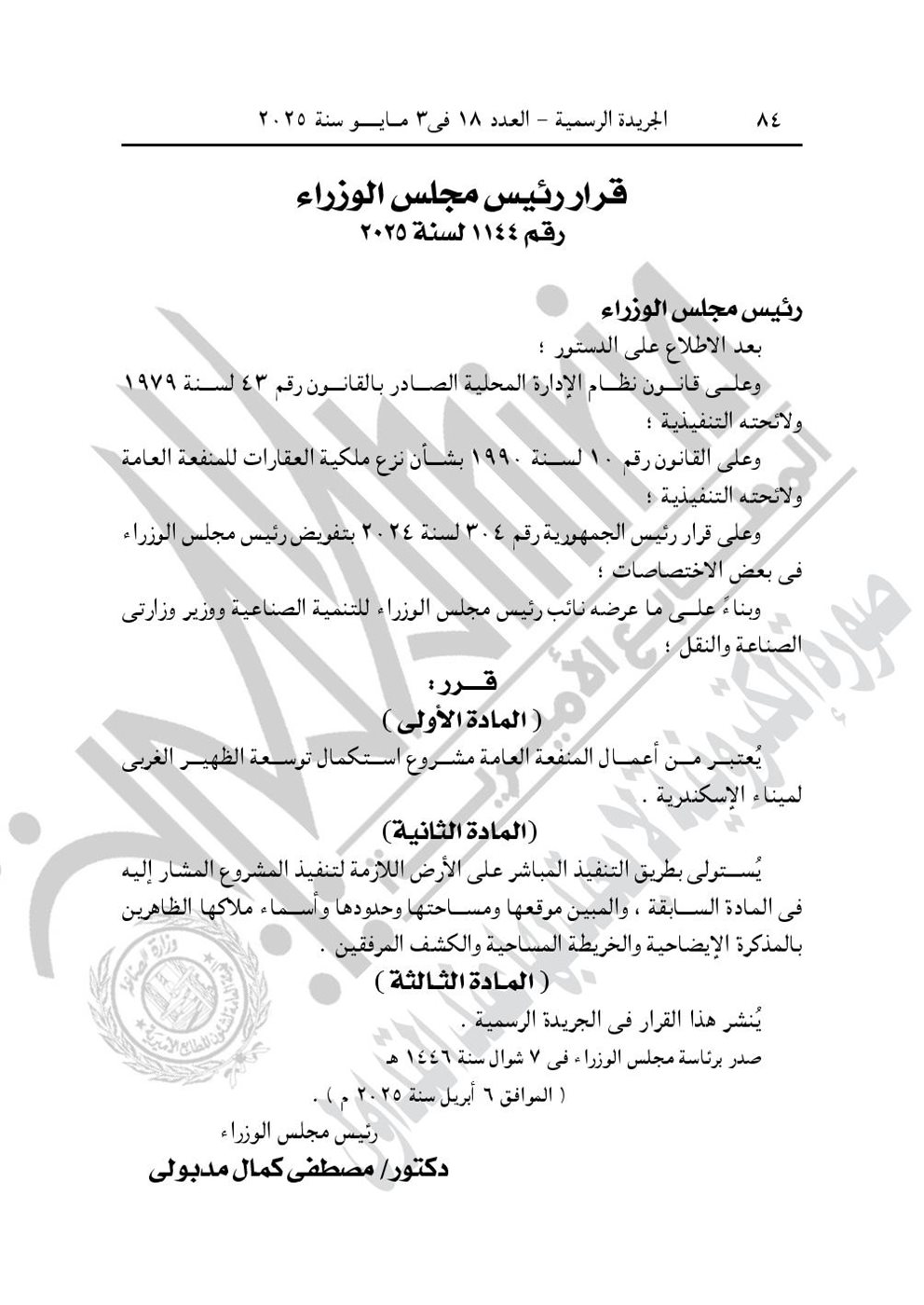-وقرار رئيس مجلس الوزراء رقم 1144 لسنة 2025، باعتبار مشروع استكمال توسعة الظهير الغربى لميناء الإسكندرية، من أعمال المنفعة العامة، ويستولى بطريق التنفيذ المباشر على الأراضى اللازمة لتنفيذ المشروع.