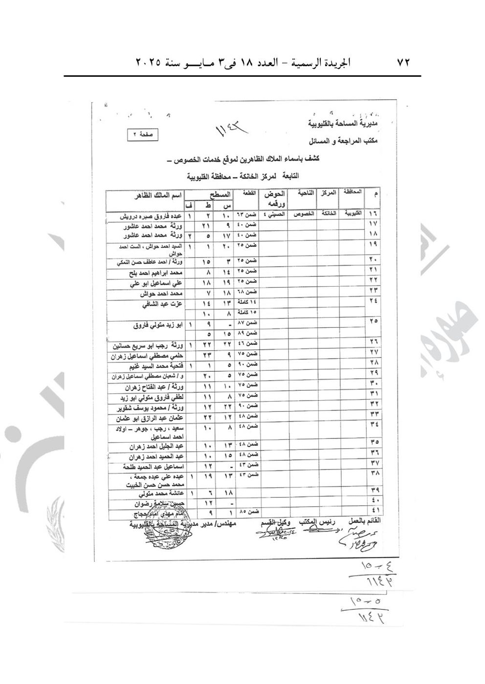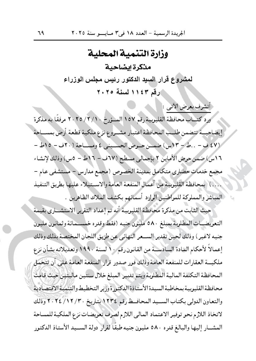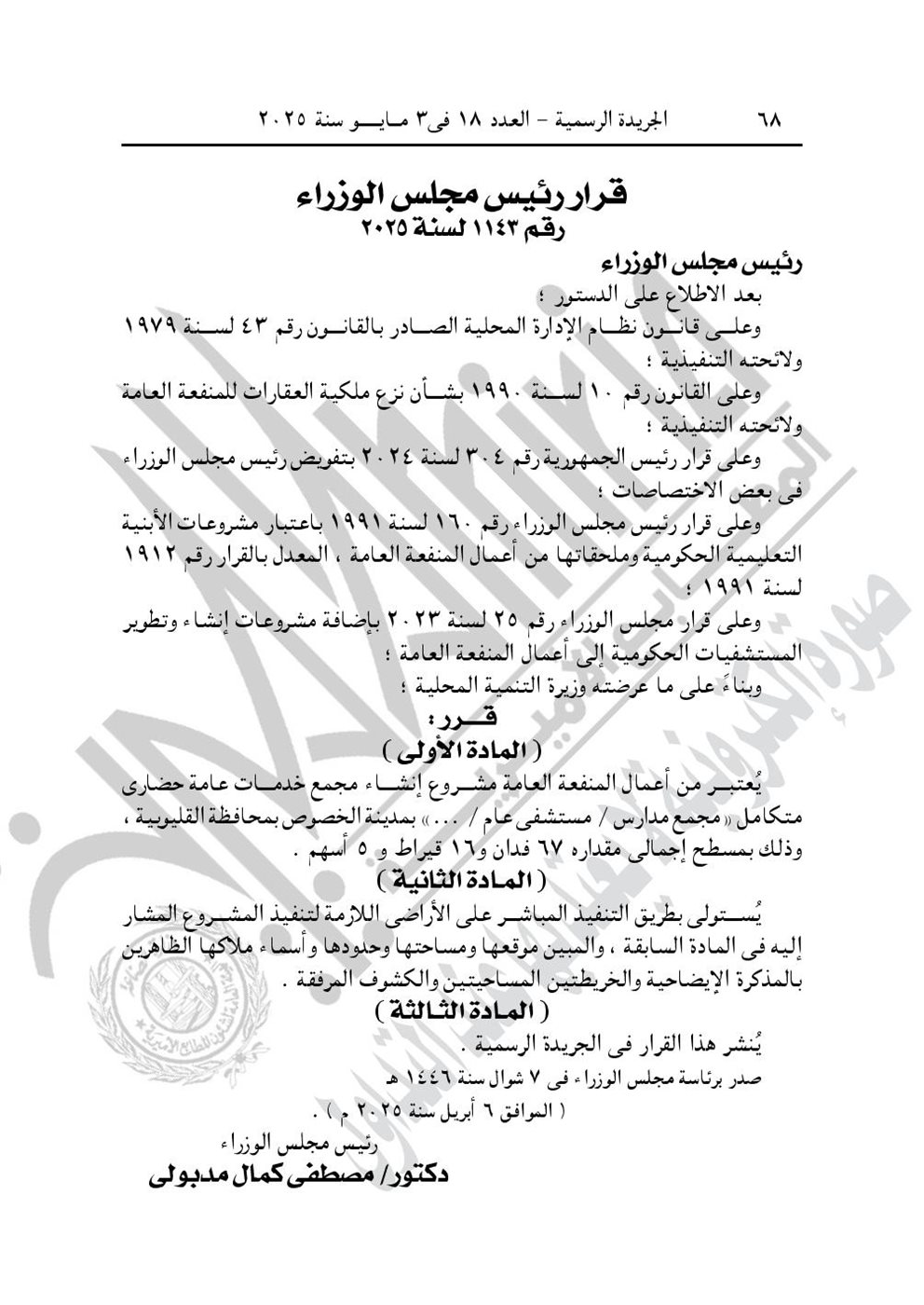 -وقرار رئيس مجلس الوزراء رقم 1143 لسنة 2025، باعتبار مشروع إنشاء مجمع خدمات عامة حضاري متكامل "مجمع مدارس/ مستشفى عام/..." بمدينة الخصوص بمحافظة القليوبية، بمسطح إجمالي 67 فدان و16 قيراط و5 أسهم، من أعمال المنفعة العامة، ويستولى بطريق التنفيذ المباشر على الأراضى اللازمة لتنفيذ المشروع.
