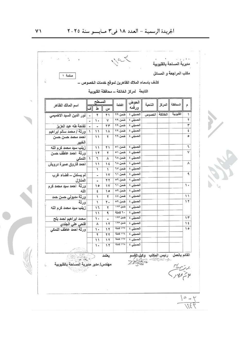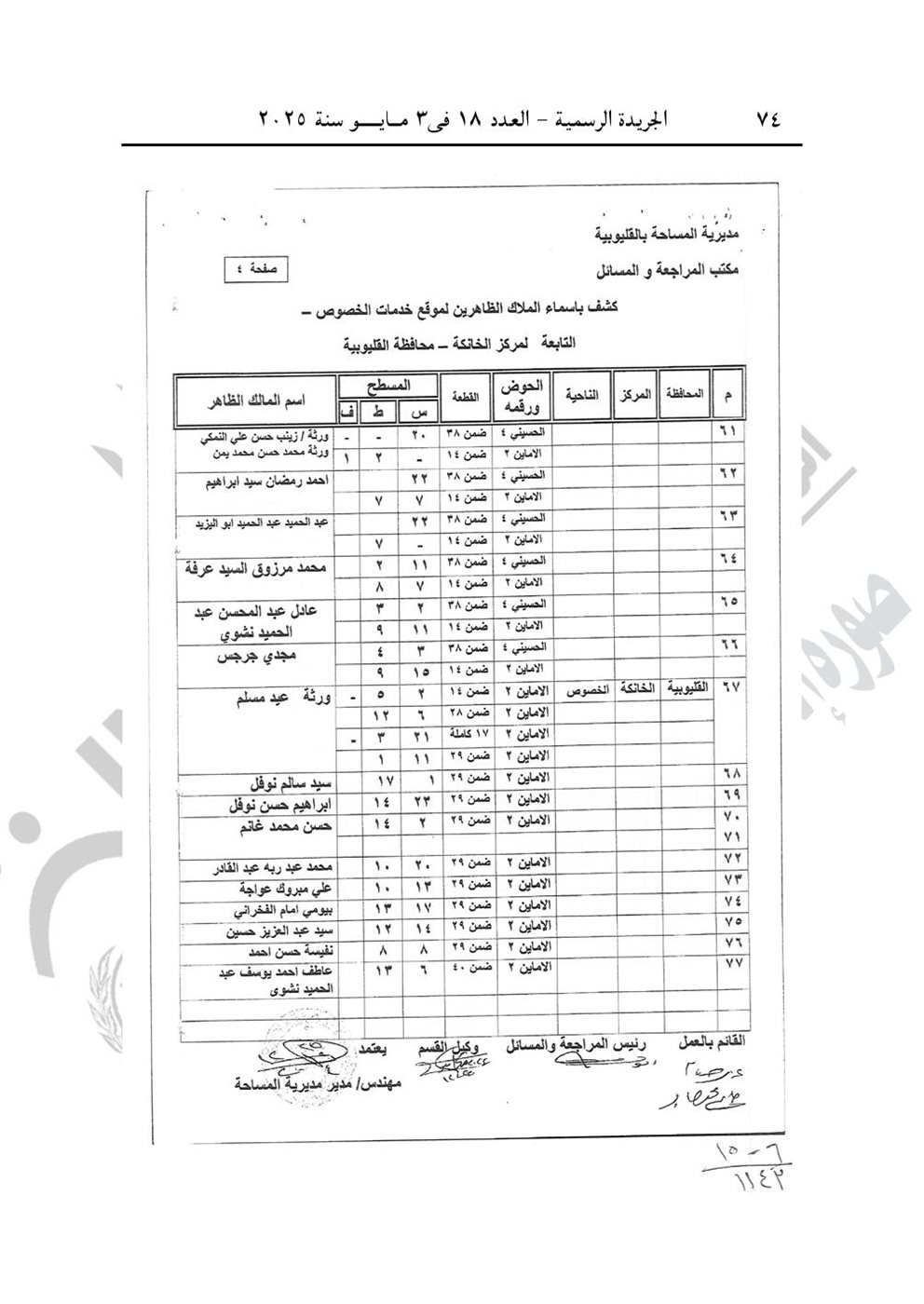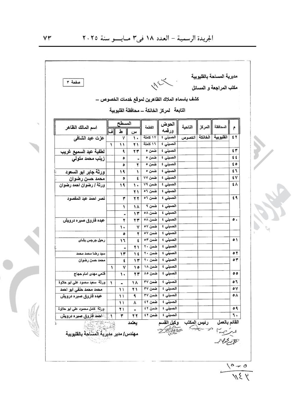 -وقرار رئيس مجلس الوزراء رقم 1143 لسنة 2025، باعتبار مشروع إنشاء مجمع خدمات عامة حضاري متكامل "مجمع مدارس/ مستشفى عام/..." بمدينة الخصوص بمحافظة القليوبية، بمسطح إجمالي 67 فدان و16 قيراط و5 أسهم، من أعمال المنفعة العامة، ويستولى بطريق التنفيذ المباشر على الأراضى اللازمة لتنفيذ المشروع.