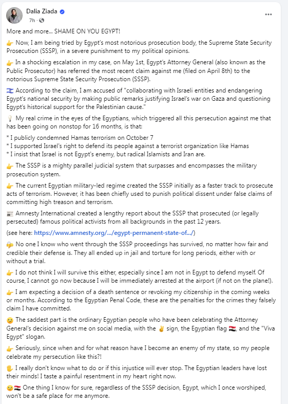 الغريب أن داليا زيادة، الهاربة من مصر، أشارت إلى أنه تم إحالتها لنيابة أمن الدولة، وأكدت أنها "أدانت علنًا المقاومة، ودعمت الاحتلال الإسرائيلي في حربه ضد غزة، واصفة المقاومة الفلسطينية بـ الإرهابية.