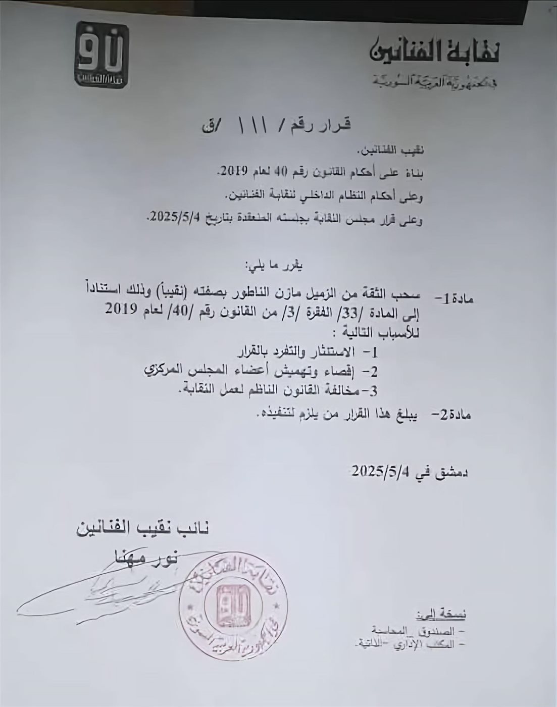 وجاء بيان نقابة الفنانين في سوريا كالتالي: قرر مجلس النقابة سحب الثقة من مازن الناطور بصفته (نقيبًا) وذلك استنادًا إلى المادة /33/ الفقرة /3/ من القانون رقم /40/ لعام 2019 للأسباب التالية الاستئثار والتفرد بالقرار، إقصاء وتهميش أعضاء المجلس المركزي، مخالفة القانون المنظم لعمل النقابة، يبلغ هذا القرار من يلزم لتنفيذه.