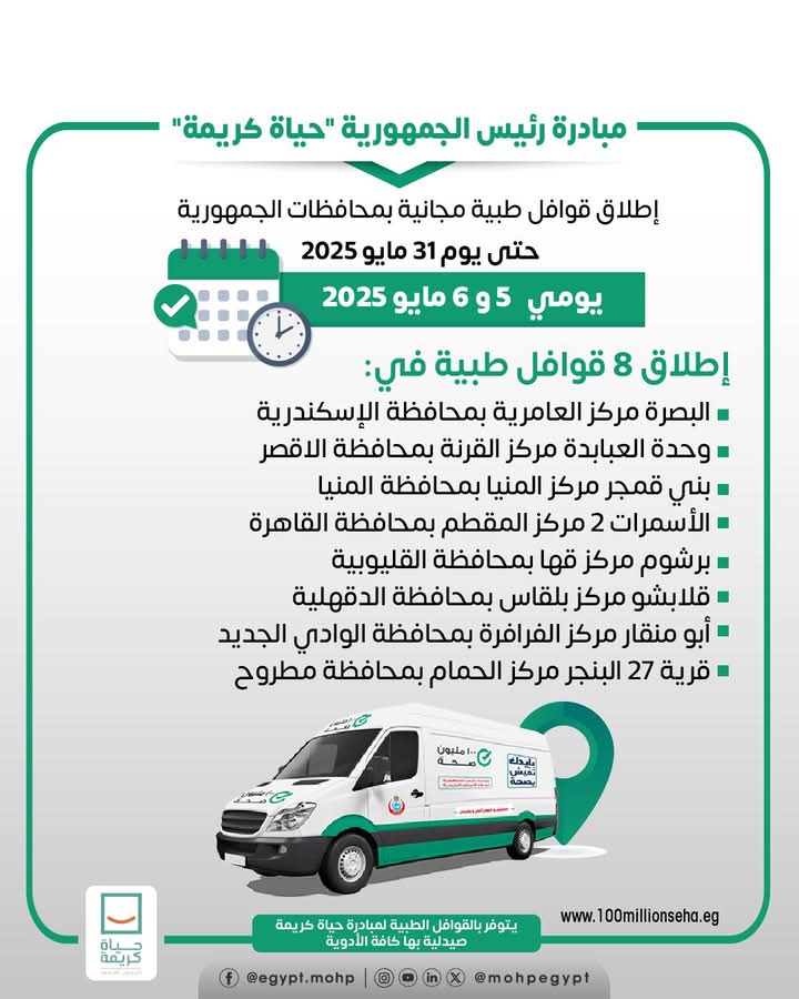 أعلنت وزارة الصحة إطلاق 8 قوافل طبية ضمن مبادرة رئيس الجمهورية حياة كريمة يومي ٥ و٦ مايو ٢٠٢٥ للكشف والعلاج مجانًا في التخصصات الطبية "نساء وولادة - خدمات تنظيم الأسرة - الأطفال والباطنة - الأنف والأذن العظام - الجراحة - الرمد الأسنان - القلب - الجلدية وخدمات الأشعة والتحاليل"