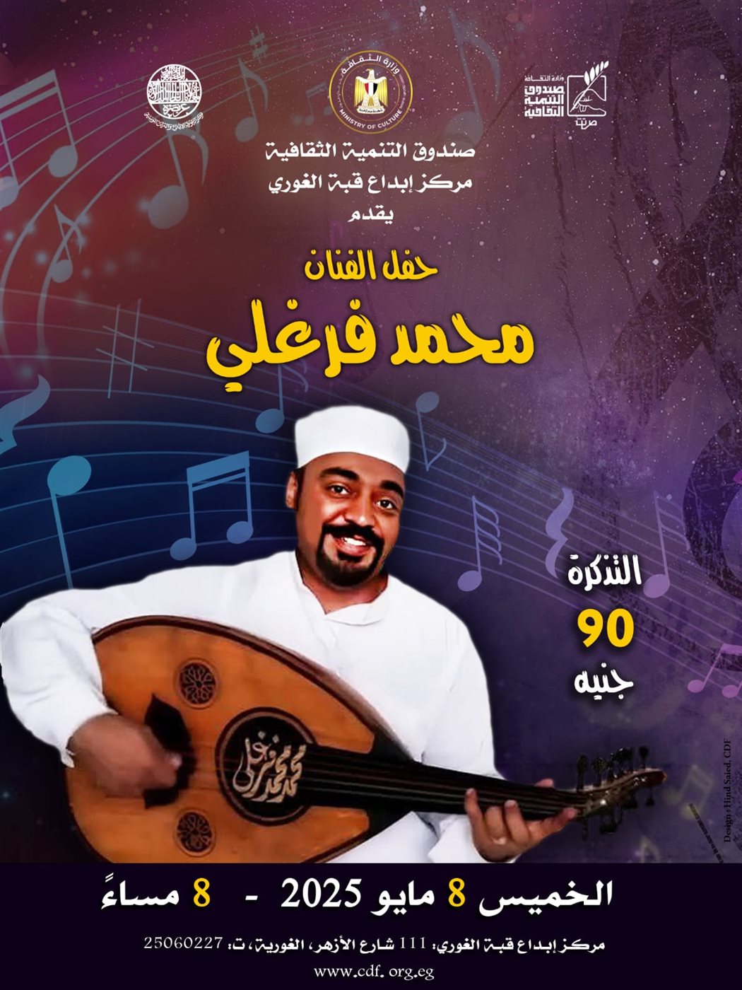 يستضيف مركز إبداع قبة الغوري بشارع الأزهر أمسية موسيقية للفنان محمد فرغلي، وذلك في تمام الساعة الثامنة مساء يوم الخميس الموافق 8 مايو، ويأتي ذلك في إطار حرص صندوق التنمية الثقافية على دعم الفنون التراثية والموسيقى الرفيعة.