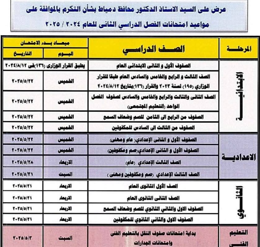 محافظ دمياط يعتمد جداول امتحانات الفصل الدراسي الثاني