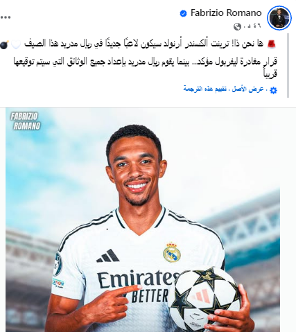 وبحسب رومانو عبر حسابه الرسمي على منصة "إكس" تويتر سابقا أن صفقة انتقال أرنولد إلى ريال مدريد قد تمت بالفعل بعد اتفاق شفهي على عقد لمدة 5 سنوات مقبلة.