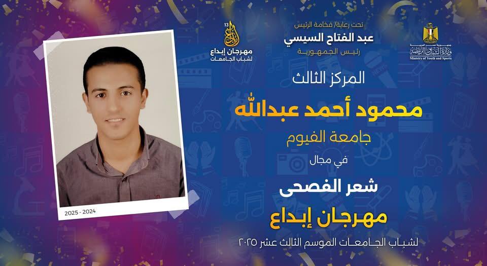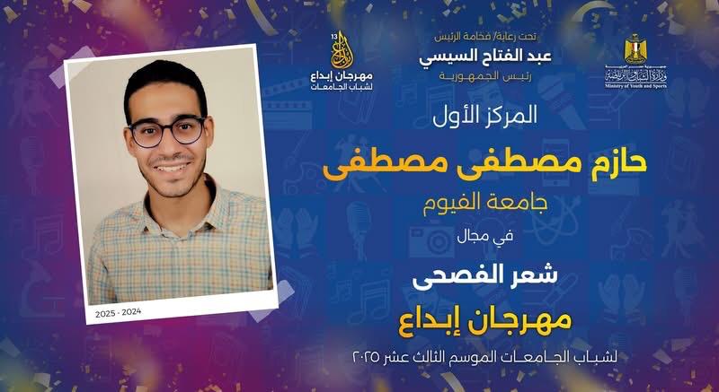وقال الدكتور شريف العطار نائب رئيس الجامعة لشئون التعليم والطلاب، أن الطالب حازم مصطفى، بكلية التربية، فاز بالمركز الأول في شعر الفصحى، وفاز الطالب محمود أحمد عبد الله، بكلية الطب، بالمركز الثالث في شعر الفصحى، كما حصد فريق جامعة الفيوم المركز الثاني في الدوري الثقافي المعلوماتي.