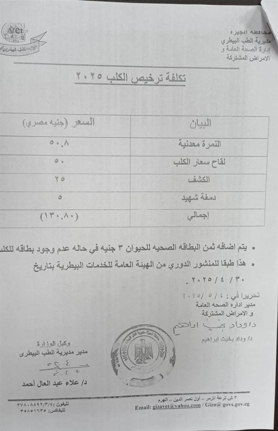 كما أوضحت المديرية أنه يتم إضافة تكلفة البطاقة الصحية للحيوان وقيمتها 3 جنيهات في حالة عدم وجود بطاقة سابقة لدى الكلب، وذلك طبقًا للتعليمات الواردة من الهيئة العامة للخدمات البيطرية.