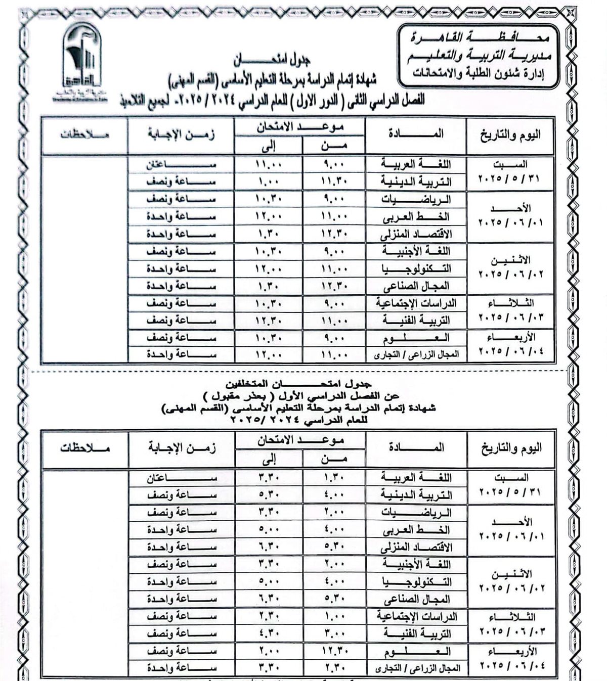 جدول امتحانات الشهادة الإعدادية للقسم المهني بالقاهرة