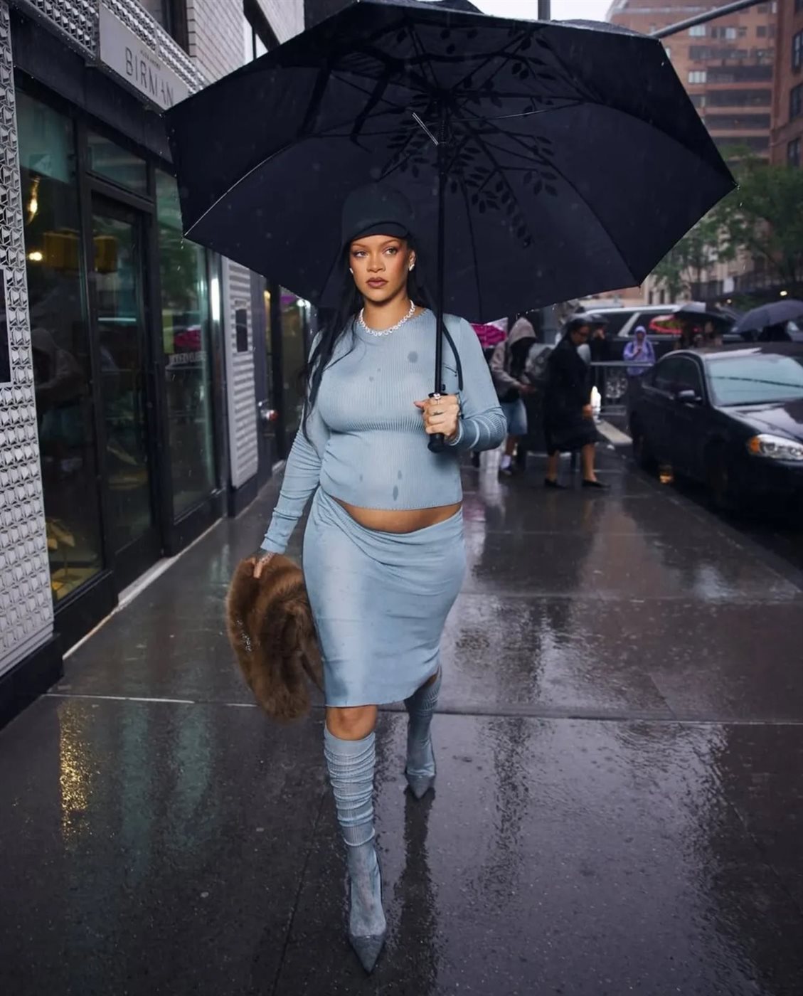في حين لم تظهر ريهانا بعد على السجادة الحمراء في متحف متروبوليتان للفنون في مدينة نيويورك، وسائل الإعلام للمغنية أثناء استعدادها لحضور الحدث في الشارع بمظلتها وبطنها التي يبدو عليها الحمل وتظهر من ملابسها الزرقاء.