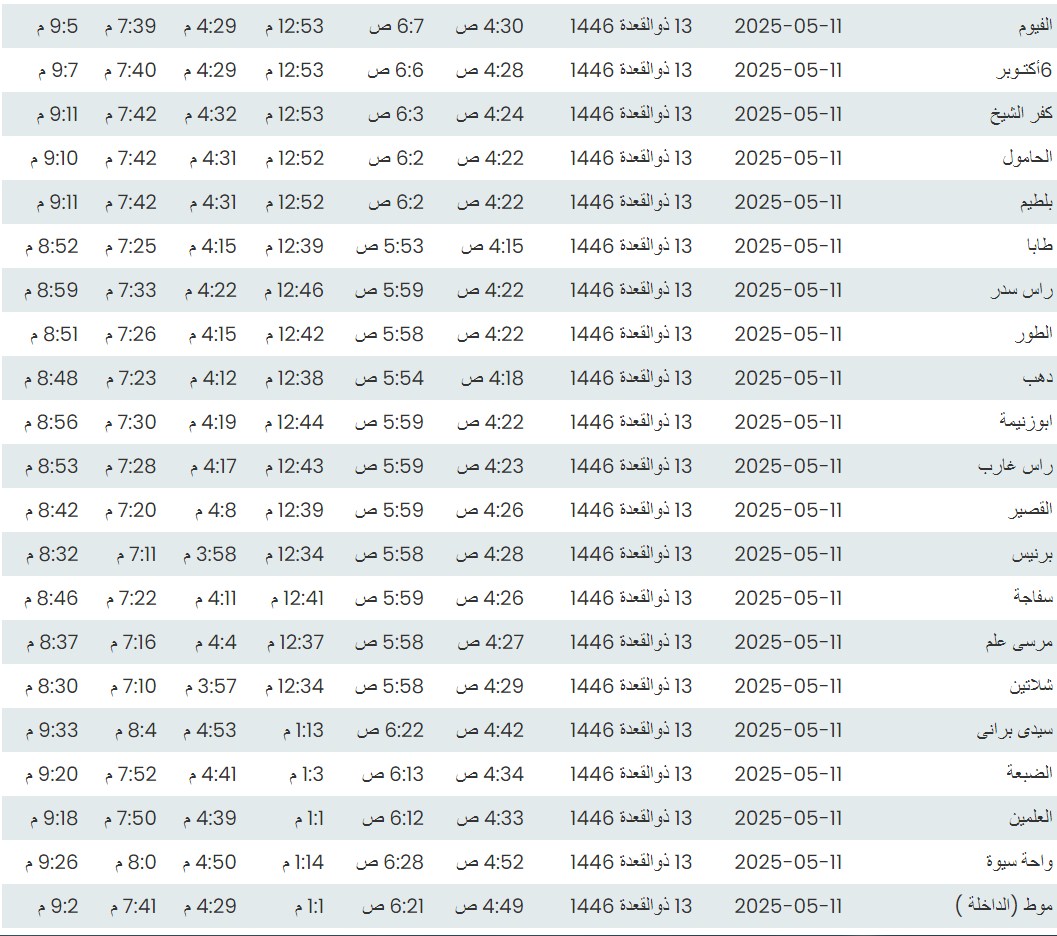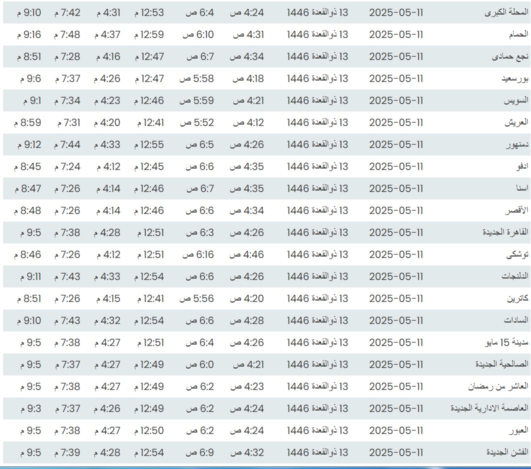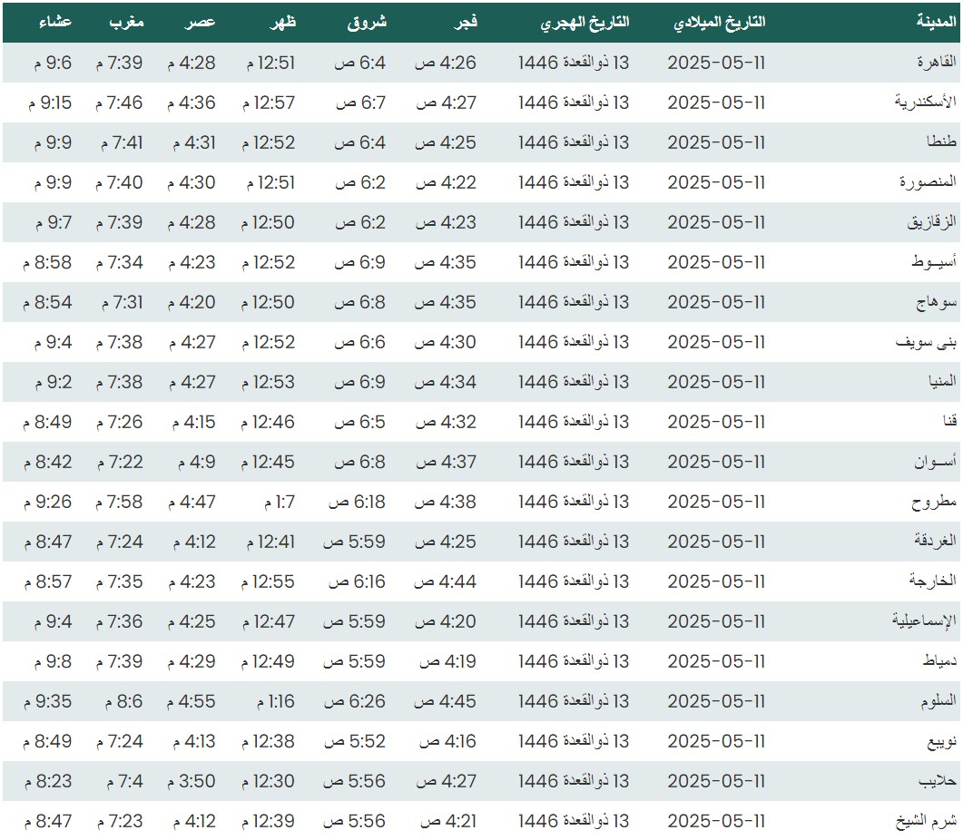 وفيما يلي مواقيت الصلاة، لعدد من مدن ومحافظات الجمهورية من واقع بيانات الهيئة العامة للمساحة