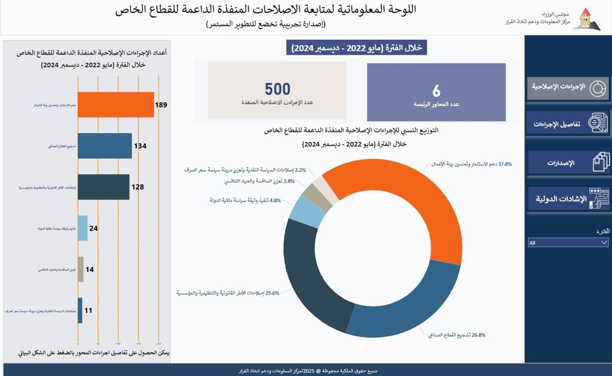 كما يمكن التفاعل مع البيانات عبر لوحة المؤشرات التفاعلية (Dashboard) المتاحة على موقع مركز المعلومات ودعم اتخاذ القرار، والتي تتيح متابعة الإصلاحات حسب المحور الزمني، ونوع الإجراء، والجهة المنفذة، وغيرها من الأبعاد التحليلية ذات الصلة.