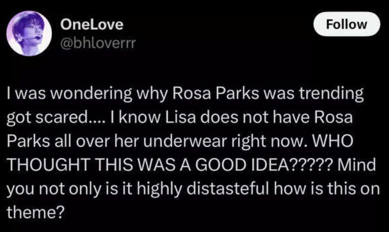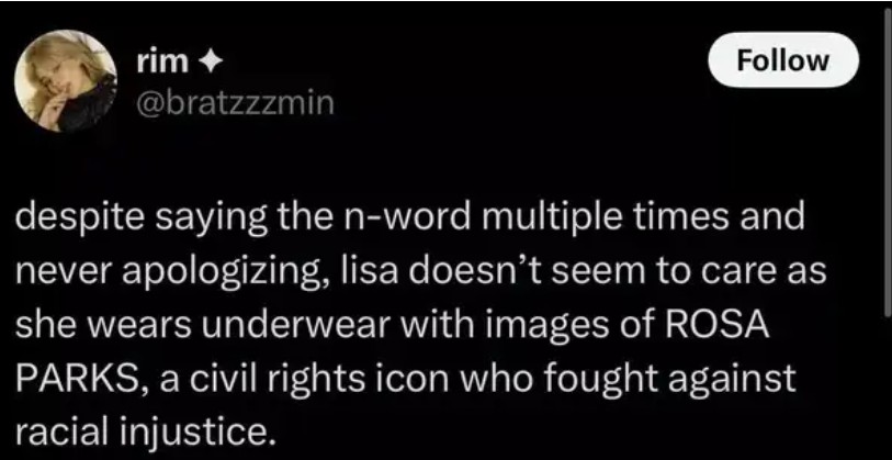 أشار أحد المستخدمين على موقع التواصل الاجتماعي “X” إلى أنه "على الرغم من قولها كلمات عنصرية عدة مرات وعدم اعتذارها، يبدو أن ليسا لا تهتم لأنها ترتدي ملابس داخلية تحمل صور روزا باركس، أيقونة الحقوق المدنية التي ناضلت ضد الظلم العنصري".