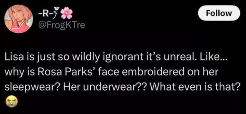 علق مستخدم ثالث: "ليسا جاهلة للغاية لدرجة أنها غير واقعية. لماذا... وجه روزا باركس مطرز على ملابس نومها؟ ملابسها الداخلية؟"
