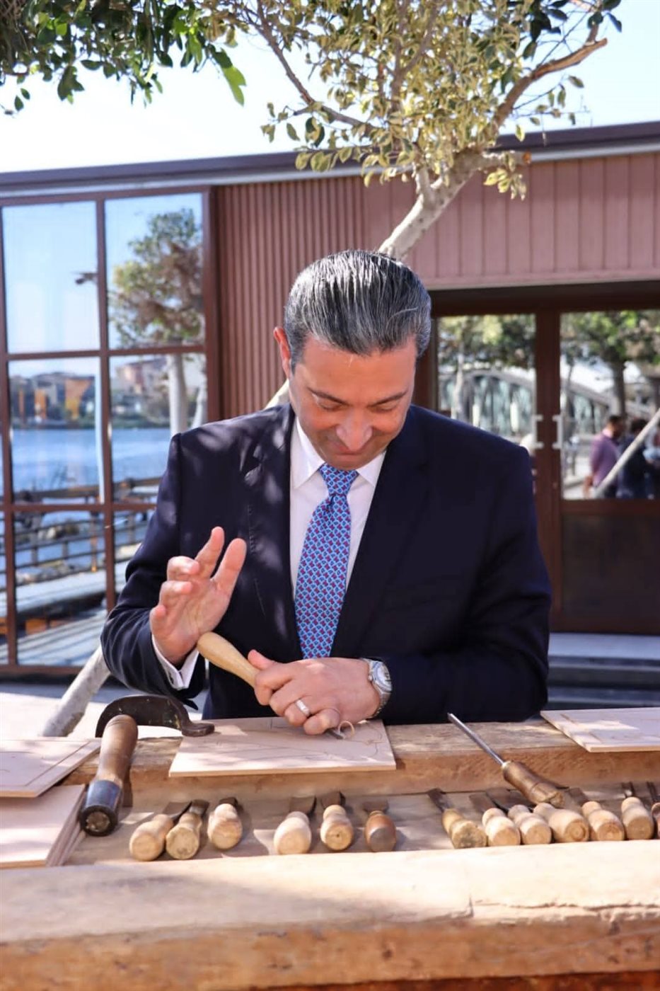 الشهابي يشارك في تجربة نحت على الخشب ويشيد بمهارة الصناع الدمايطة في فن الأويما