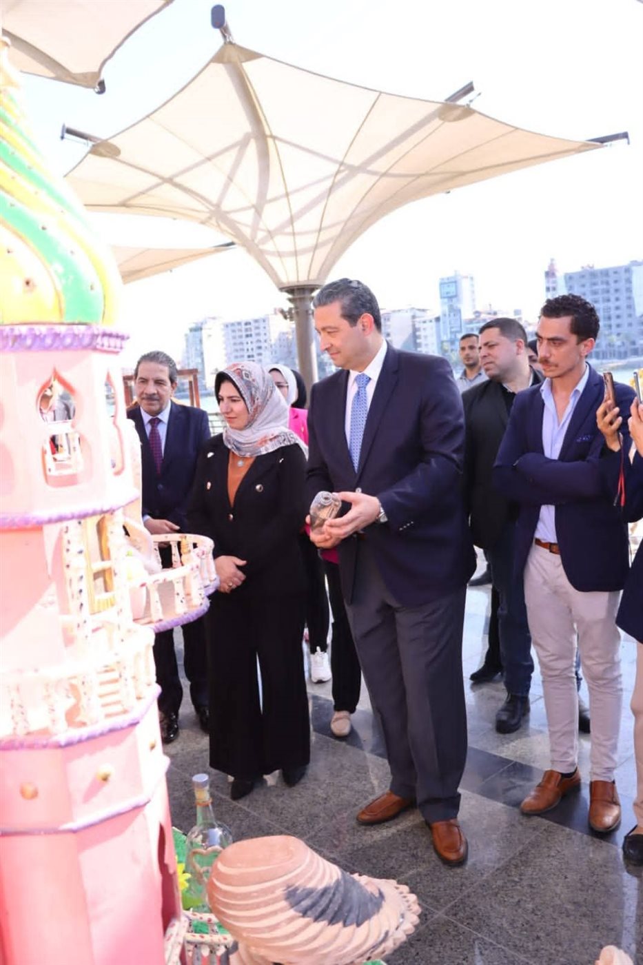 رافق المحافظ خلال الافتتاح المهندسة شيماء الصديق نائب المحافظ والمهندس حسام شبكة مدير فرع جهاز تنمية المشروعات الصغيرة والمتوسطة وشيرين عكاشة رئيس وحدة السكان ورنا سرحان مدير إدارة الكوبري إلى جانب مشاركة واسعة من الحرفيين المتخصصين في النحت على الخشب.