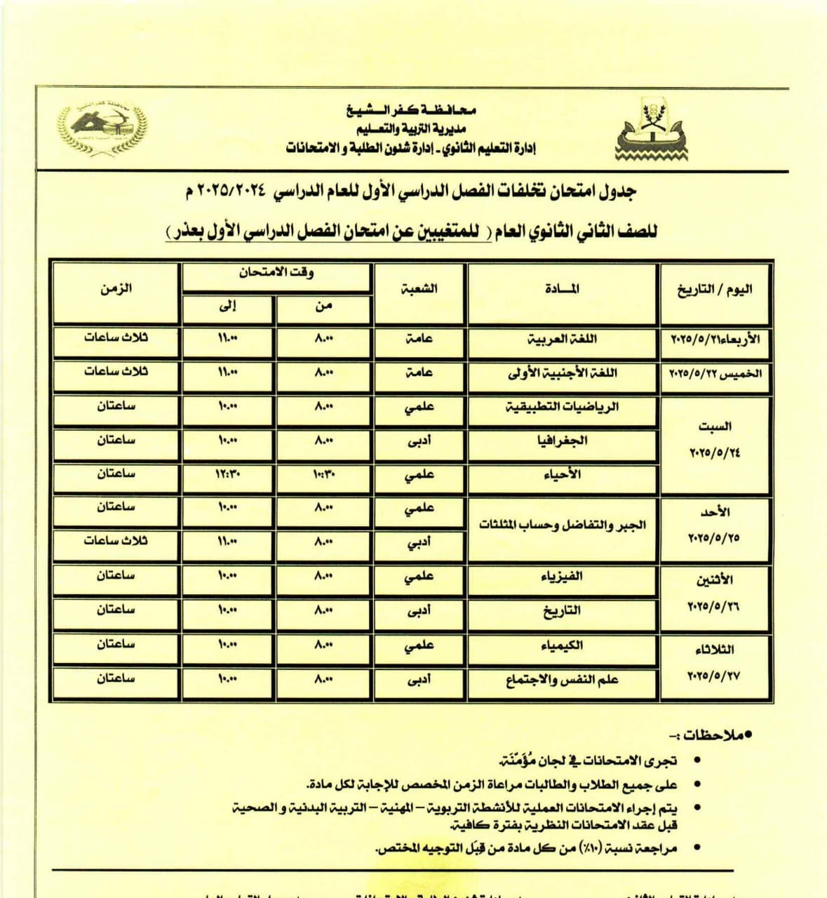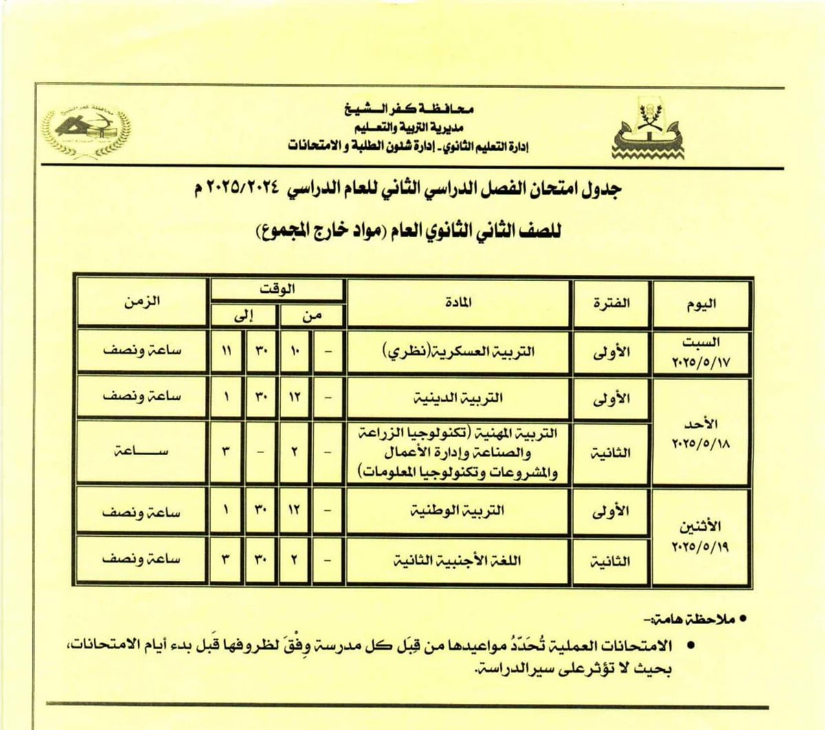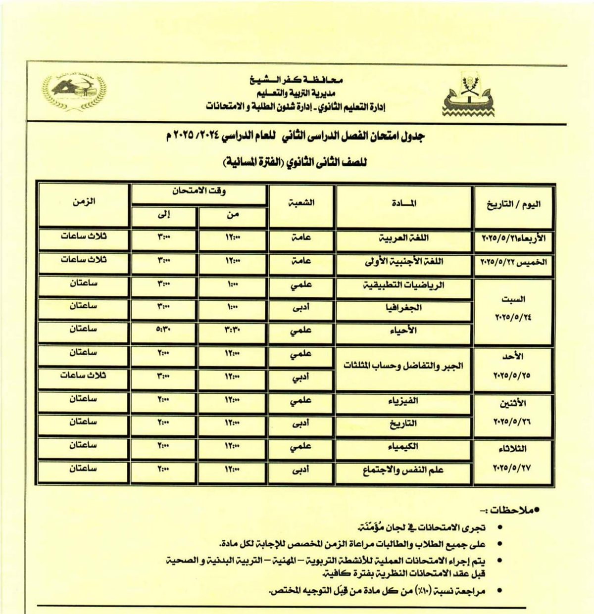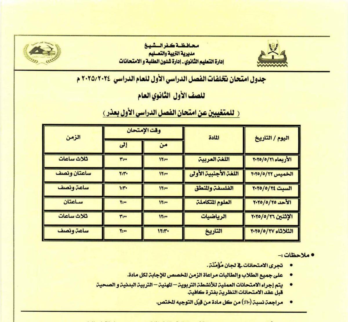 مواعيد امتحانات الفصل الدراسي الثاني للصف الأول والثاني الثانوي بكفر الشيخ