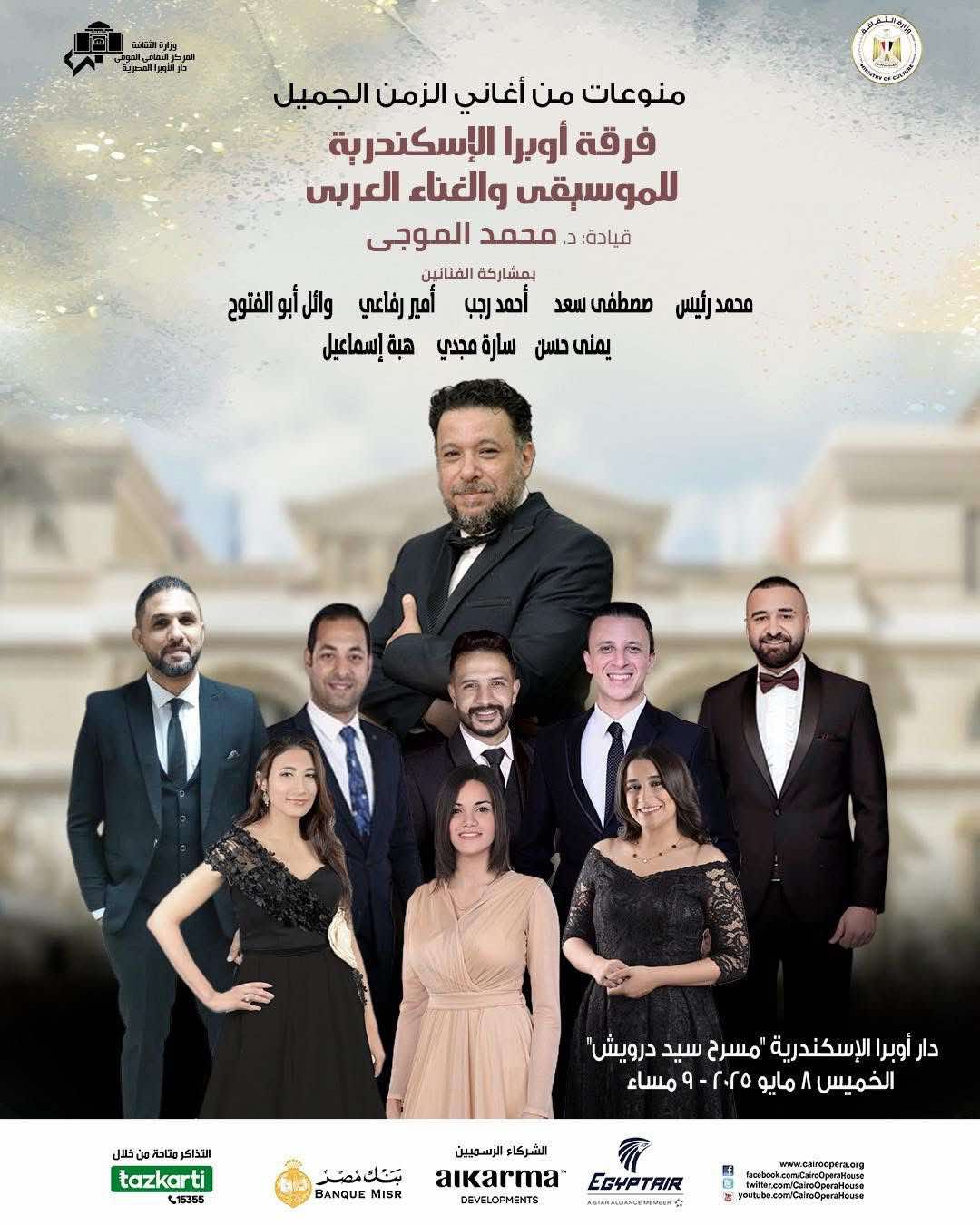 تنظم دار الأوبرا المصرية برئاسة الدكتور علاء عبد السلام حفلًا لفرقة أوبرا الإسكندرية للموسيقى والغناء العربى بقيادة المايسترو الدكتور محمد الموجى فى التاسعة مساء الخميس ٨ مايو على مسرح سيد درويش (أوبرا الإسكندرية).
