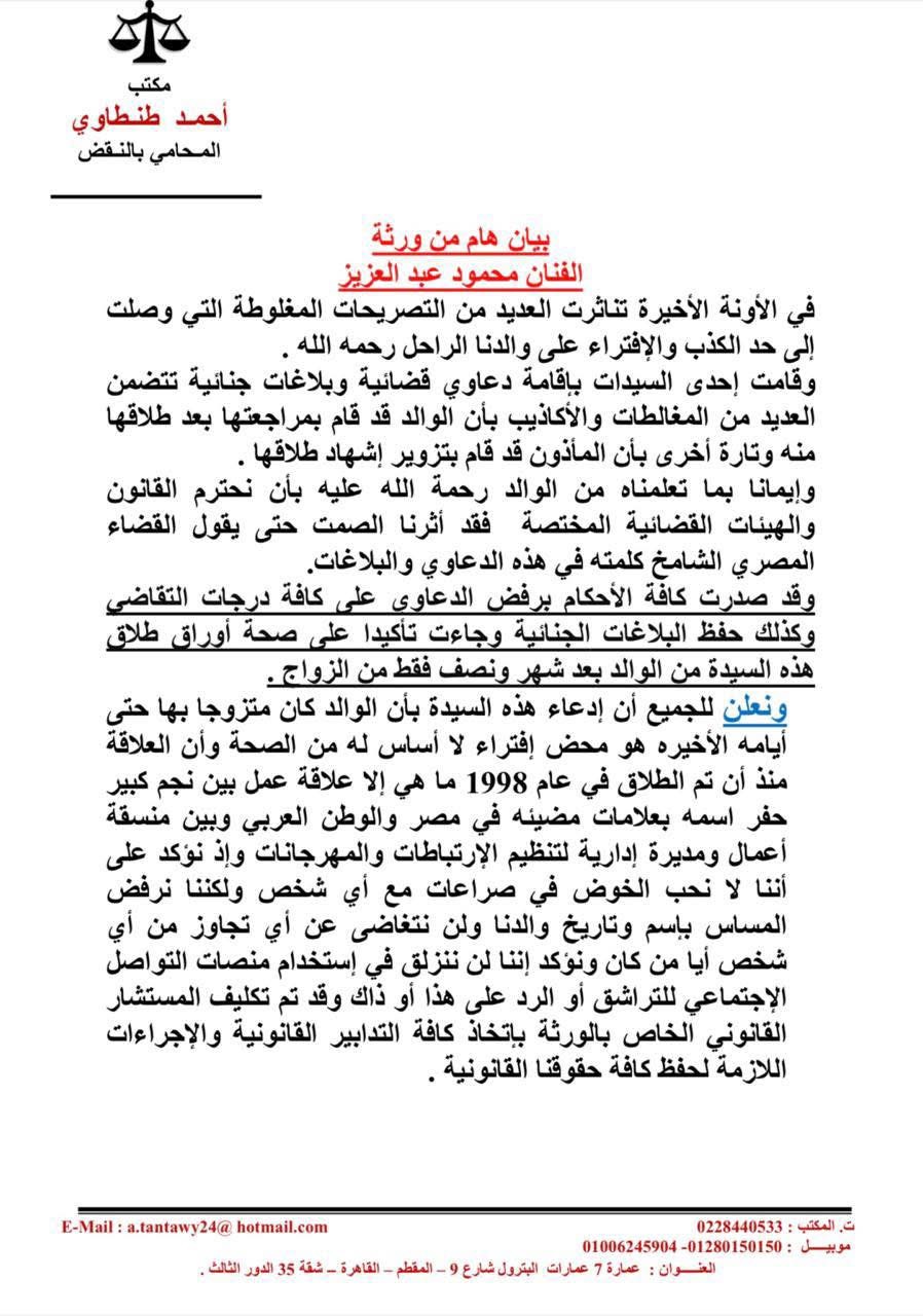 كما أكد ورثة الراحل محمود عبد العزيز: "نرفض المساس باسم وتاريخ والدنا ولن نتغاضى عن أي تجاوز من أي شخص أيا من كان، ونؤكد أننا لن ننزلق في استخدام منصات التواصل الاجتماعي للتراشق أو الرد على هذا أو ذاك وقد تم تكليف المستشار القانوني الخاص بالورثة باتخاذ كافة التدابير القانونية والإجراءات اللازمة لحفظ كافة حقوقنا القانونية".