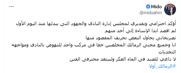 وقال أحمد حسام "ميدو" في رسالته التي وجهها لمجلس إدارة الزمالك: "أؤكد احترامي وتقديري لمجلس إدارة النادي والجهود التي يبذلها منذ اليوم الأول. لم اقصد أبدا الإساءة إلى أحد منهم. تصريحاتي يحاول البعض تحريف المقصود منها. أنا وجميع محبي الزمالك المخلصين حقا في مركب واحد للنهوض بالنادي ومواجهة التحديات. لا داعي للصيد فى الماء العكر وليبتعد محترفي الفتن. الزمالك أولا".