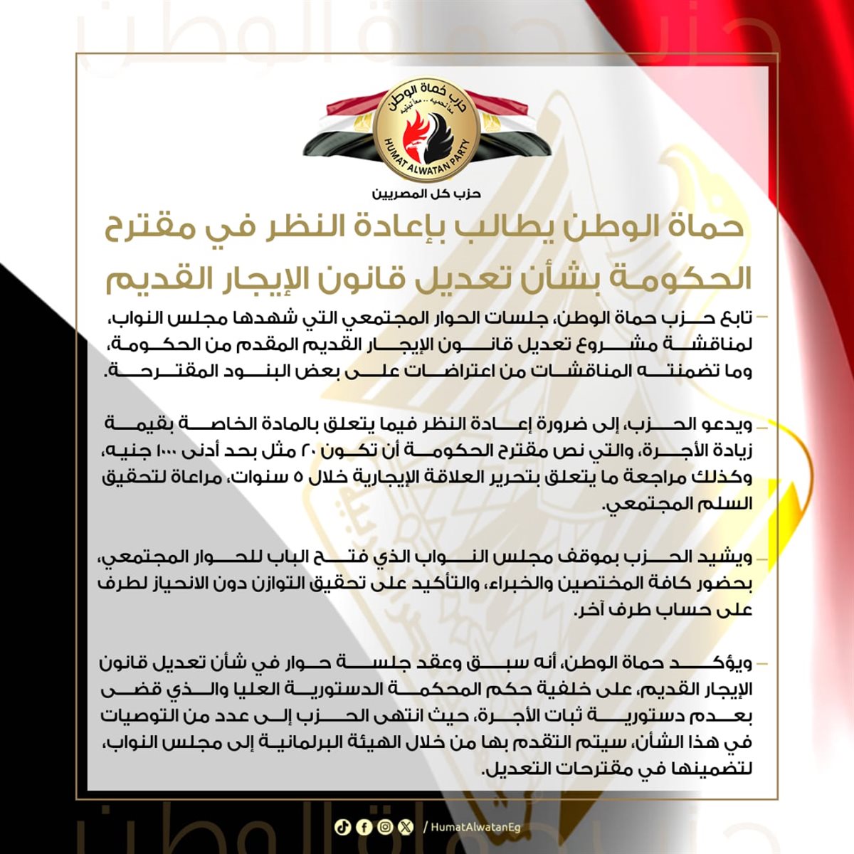 وأكد حماة الوطن، أنه سبق وعقد جلسة حوار في شأن تعديل قانون الإيجار القديم، على خلفية حكم المحكمة الدستورية العليا والذي قضى بعدم دستورية ثبات الأجرة، حيث انتهى الحزب إلى عدد من التوصيات في هذا الشأن، سيتم التقدم بها من خلال الهيئة البرلمانية إلى مجلس النواب، لتضمينها في مقترحات التعديل.