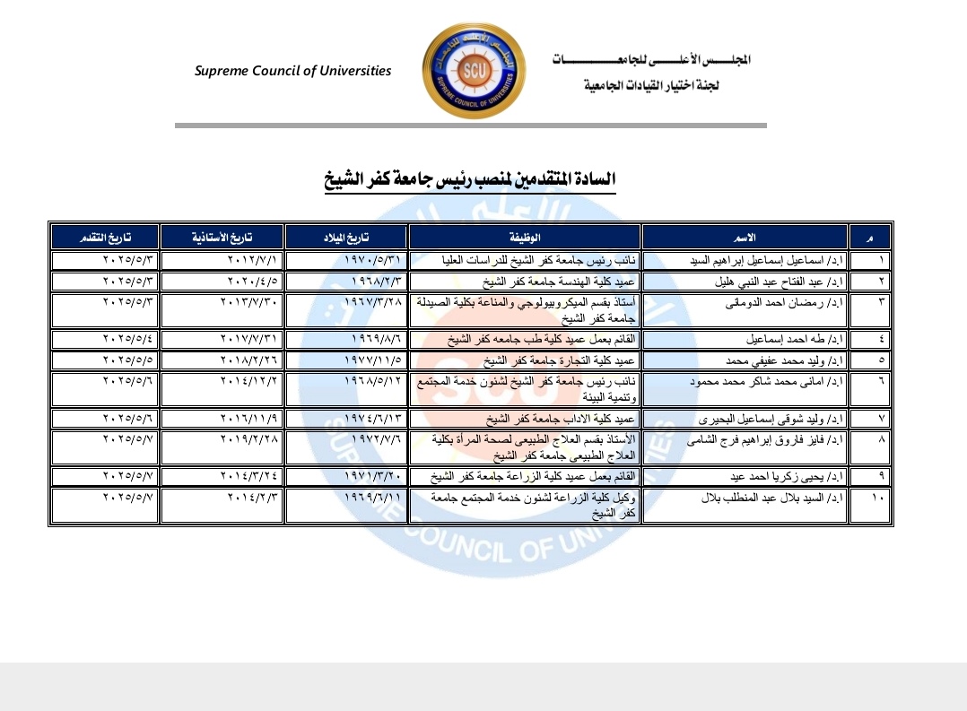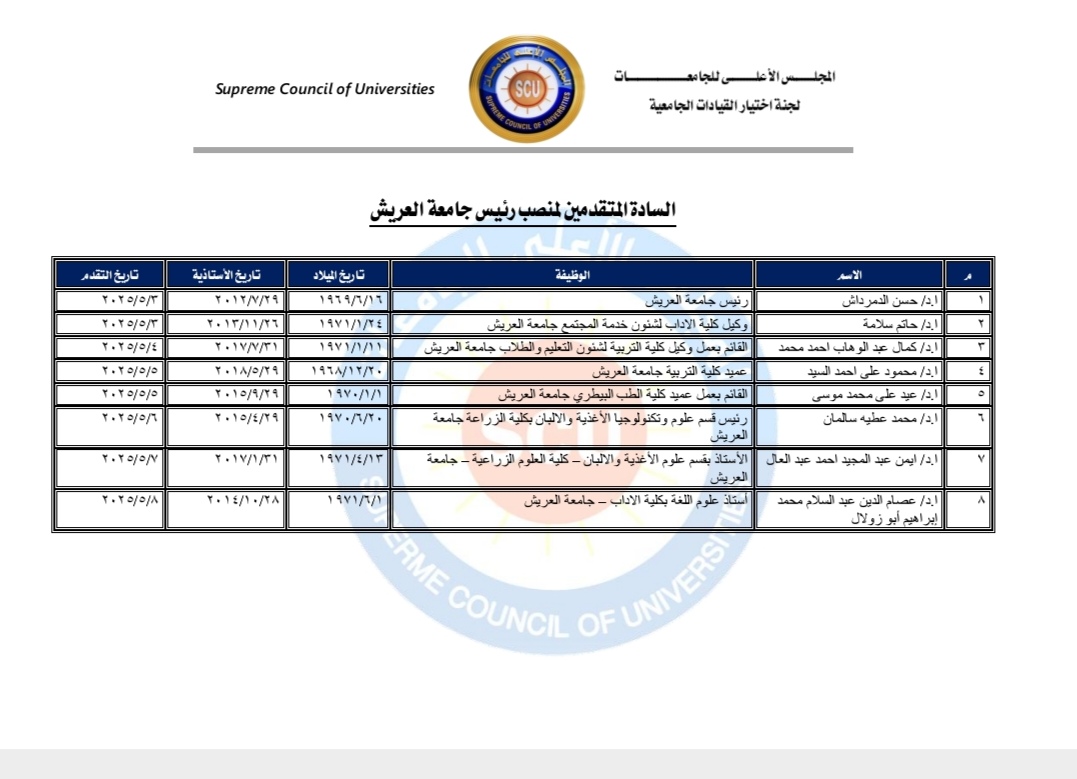 وكان قد حدد المجلس الأعلى للجامعات، مجموعة من المستندات المطلوب أن يتقدم بها المرشح لرئاسة أي جامعة من الجامعات الخمس، للجنة اختيار القيادات الجامعية، وجاءت كالتالي: