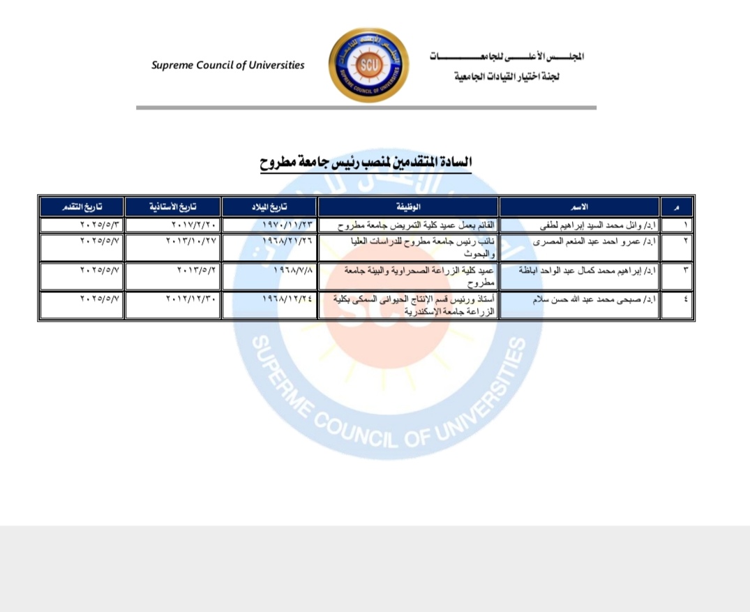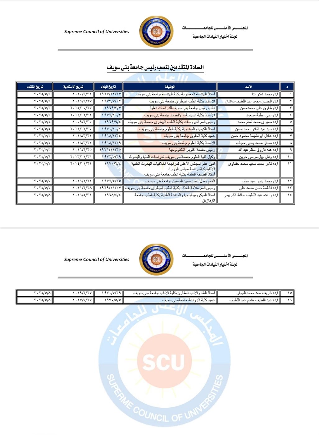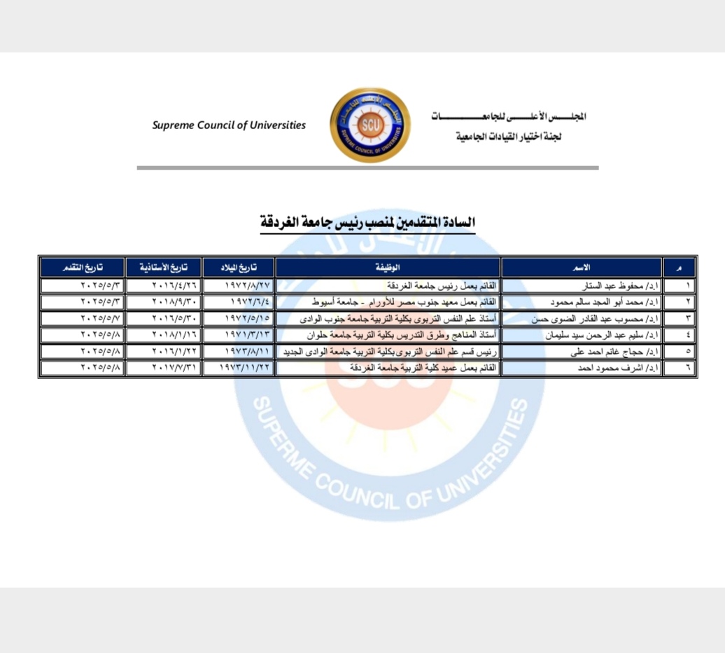 أعلن المجلس الأعلى للجامعات القوائم المبدئية للمرشحين على رئاسة 5 جامعات حكومية، هي “كفر الشيخ، بني سويف، الغردقة، مطروح، العريش”.