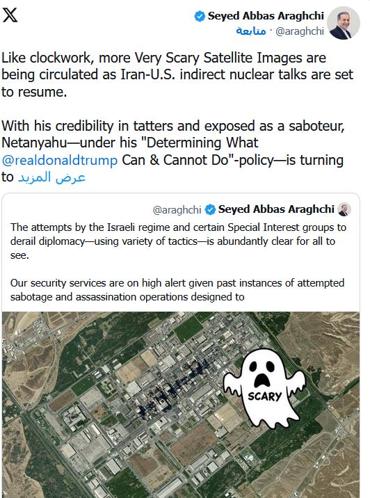 وكتب عباس عراقجي عبر حسابه على منصة "إكس": "كالعادة، تُتداول صور أقمار صناعية مخيفة للغاية مع استئناف المفاوضات النووية غير المباشرة بين إيران والولايات المتحدة".