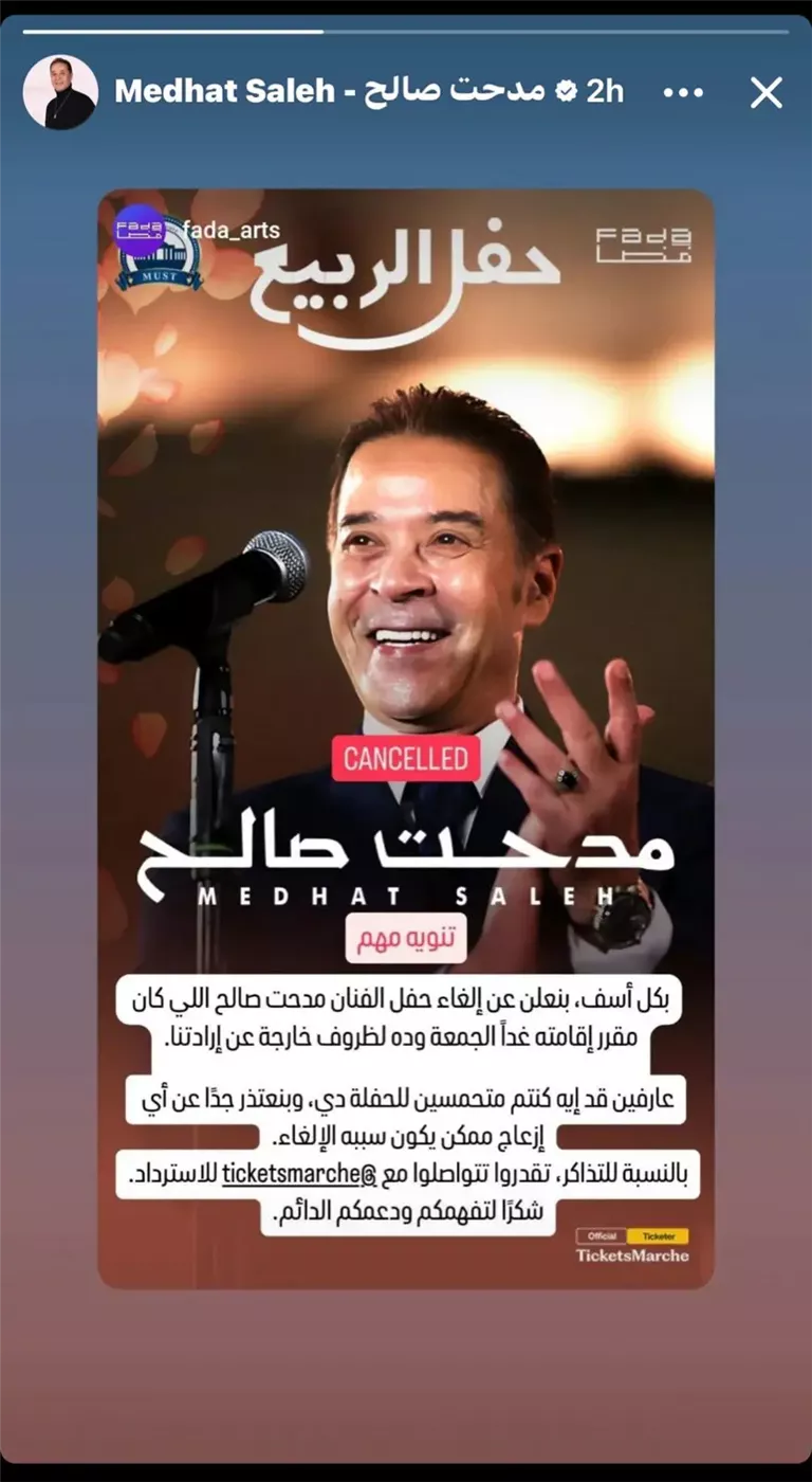 وتابعت: “بكل أسف بنعلن عن إلغاء حفل الفنان مدحت صالح اللي كان مقرر إقامته اليوم الجمعة، وده لظروف خارجة عن إرادتنا”.