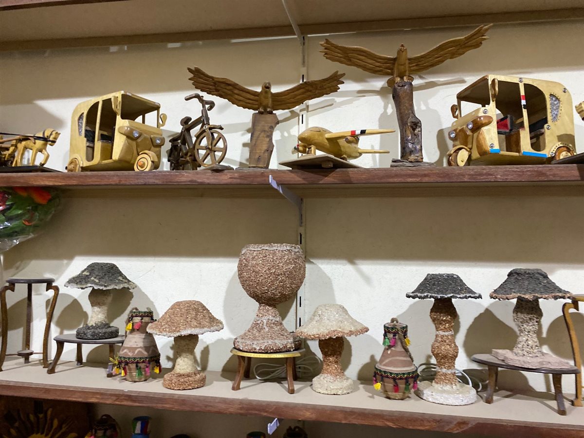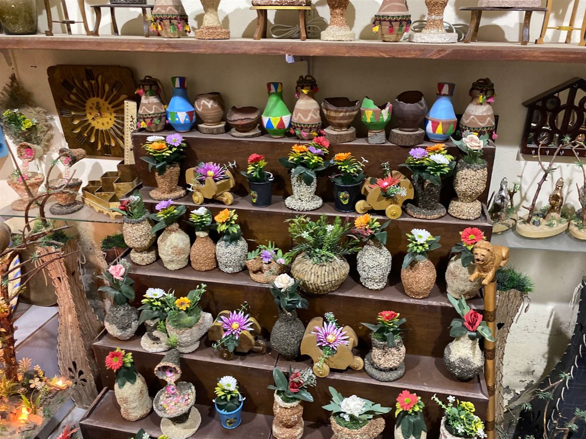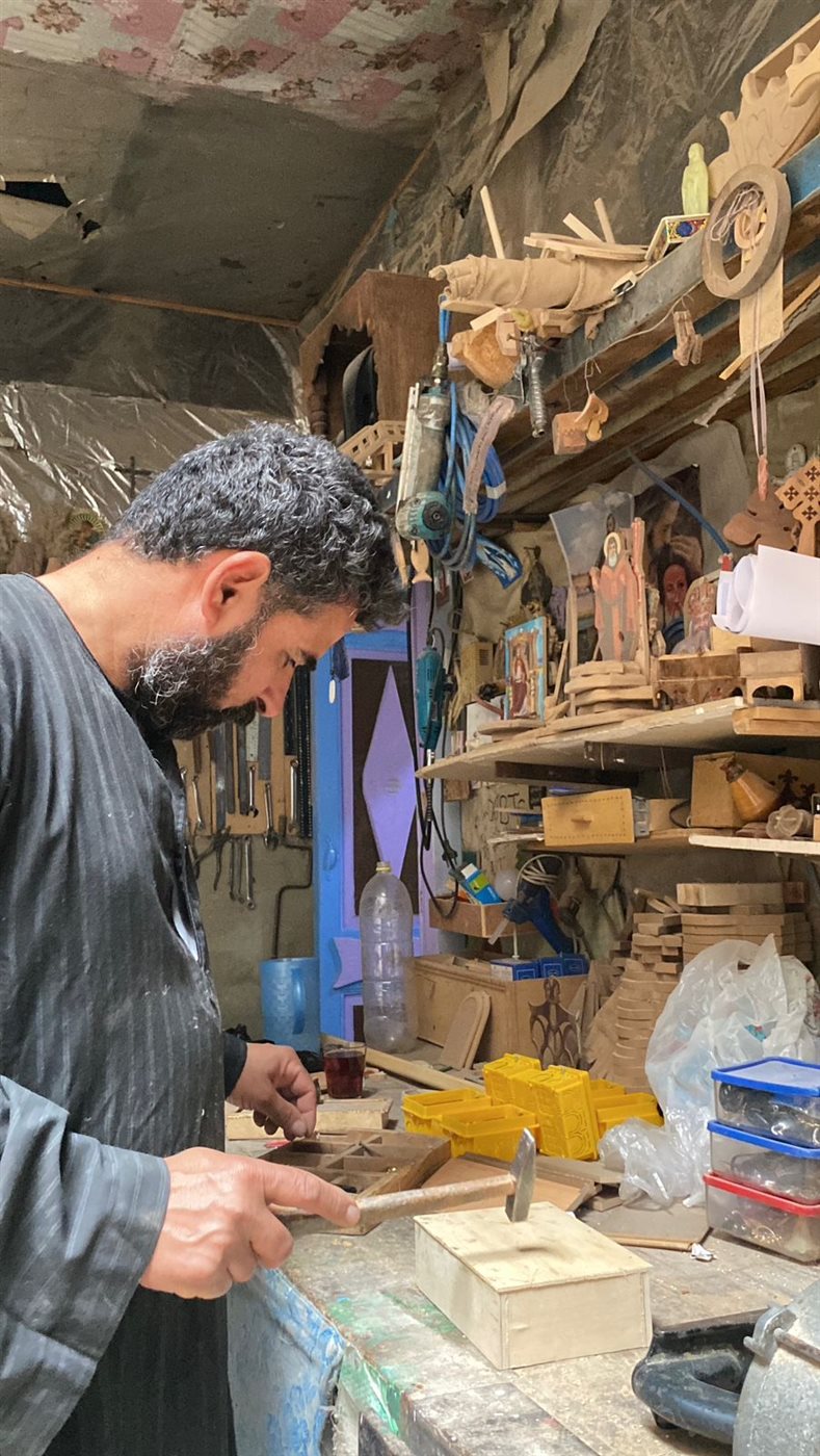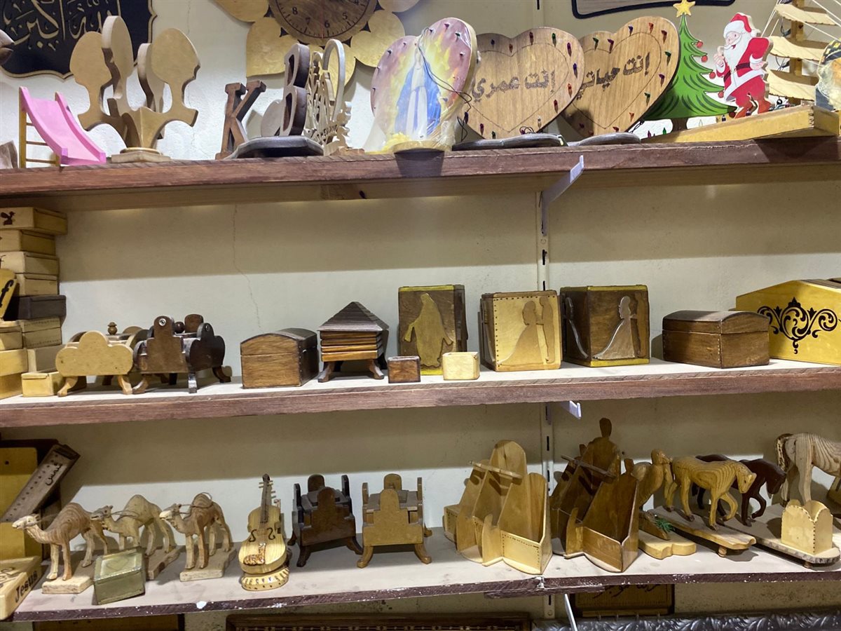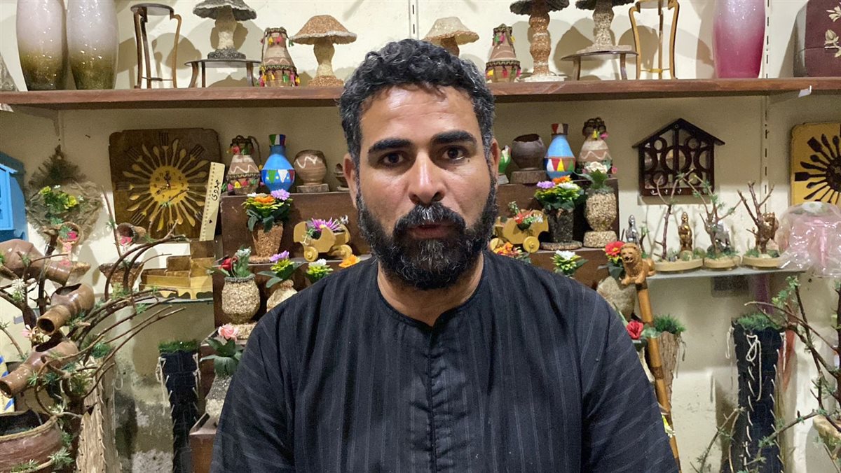 يعرض عاطف في بيته مجموعة متنوعة من منتجاته اليدوية المميزة.