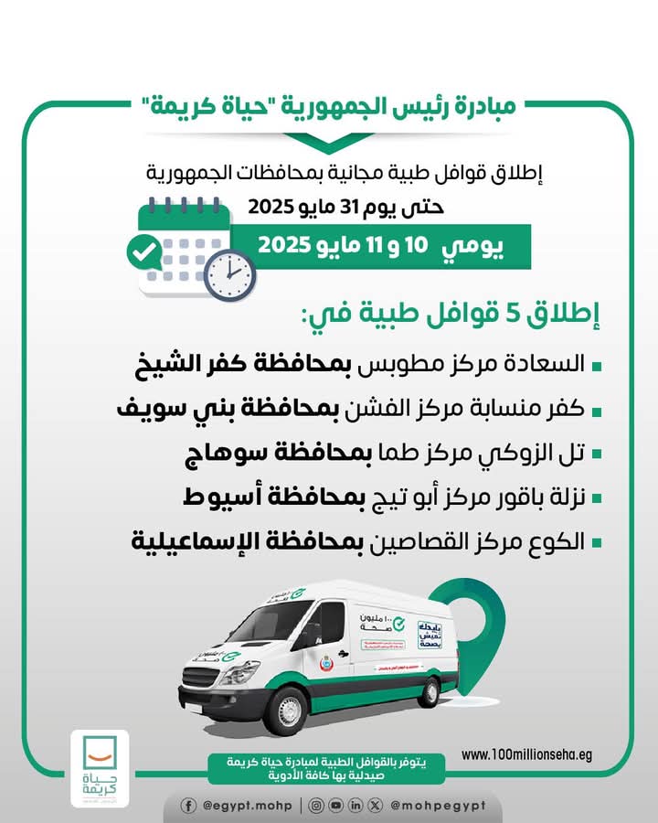 أعلنت وزارة الصحة عن إطلاق 5 قوافل طبية ضمن مبادرة رئيس الجمهورية حياة كريمة يومي ١٠ و١١ مايو ٢٠٢٥ للكشف والعلاج مجانًا في التخصصات الطبية "نساء وولادة - خدمات تنظيم الأسرة - الأطفال والباطنة - الأنف والأذن والعظام - الجراحة - الرمد الأسنان - القلب - الجلدية وخدمات الأشعة والتحاليل.