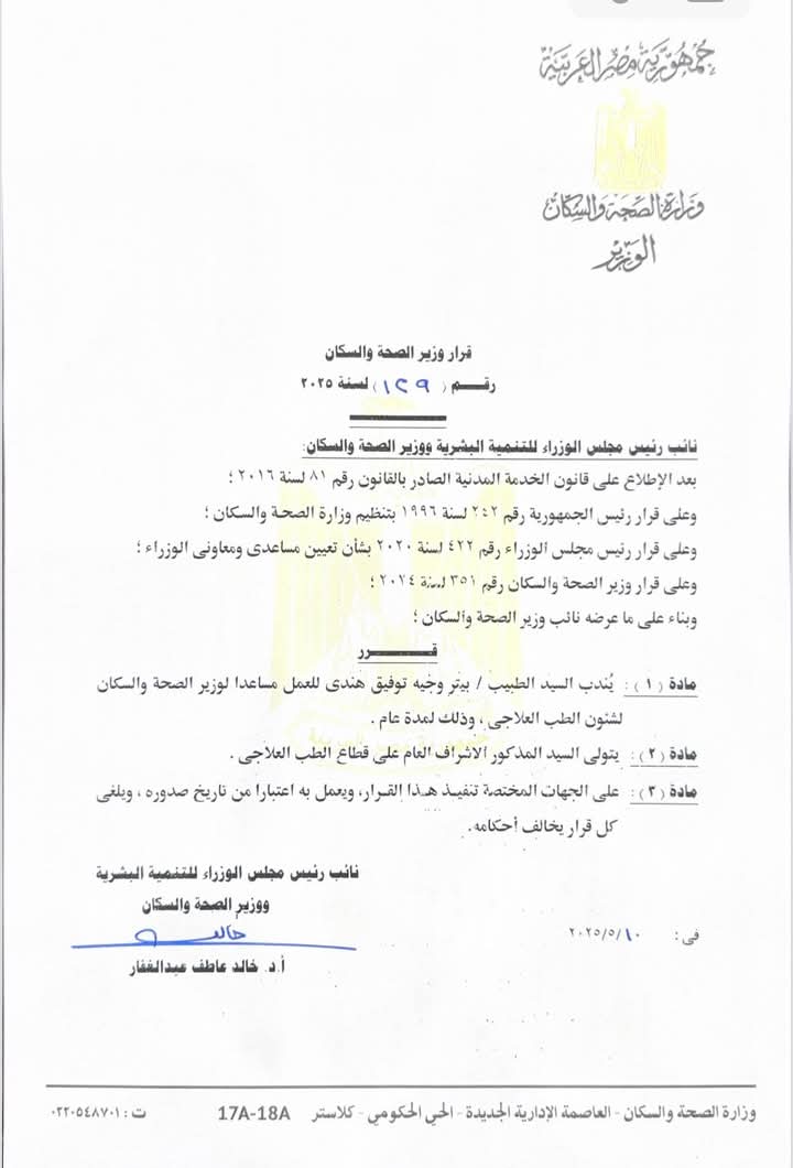أصدر الدكتور خالد عبدالغفار نائب رئيس مجلس الوزراء وزير الصحة والسكان قرار ١٢٩ لسنة ٢٠٢٥، بتعيين الدكتور بيتر وجيه مساعدا لوزير الصحة لشئون الطب العلاجي لمدة عام.