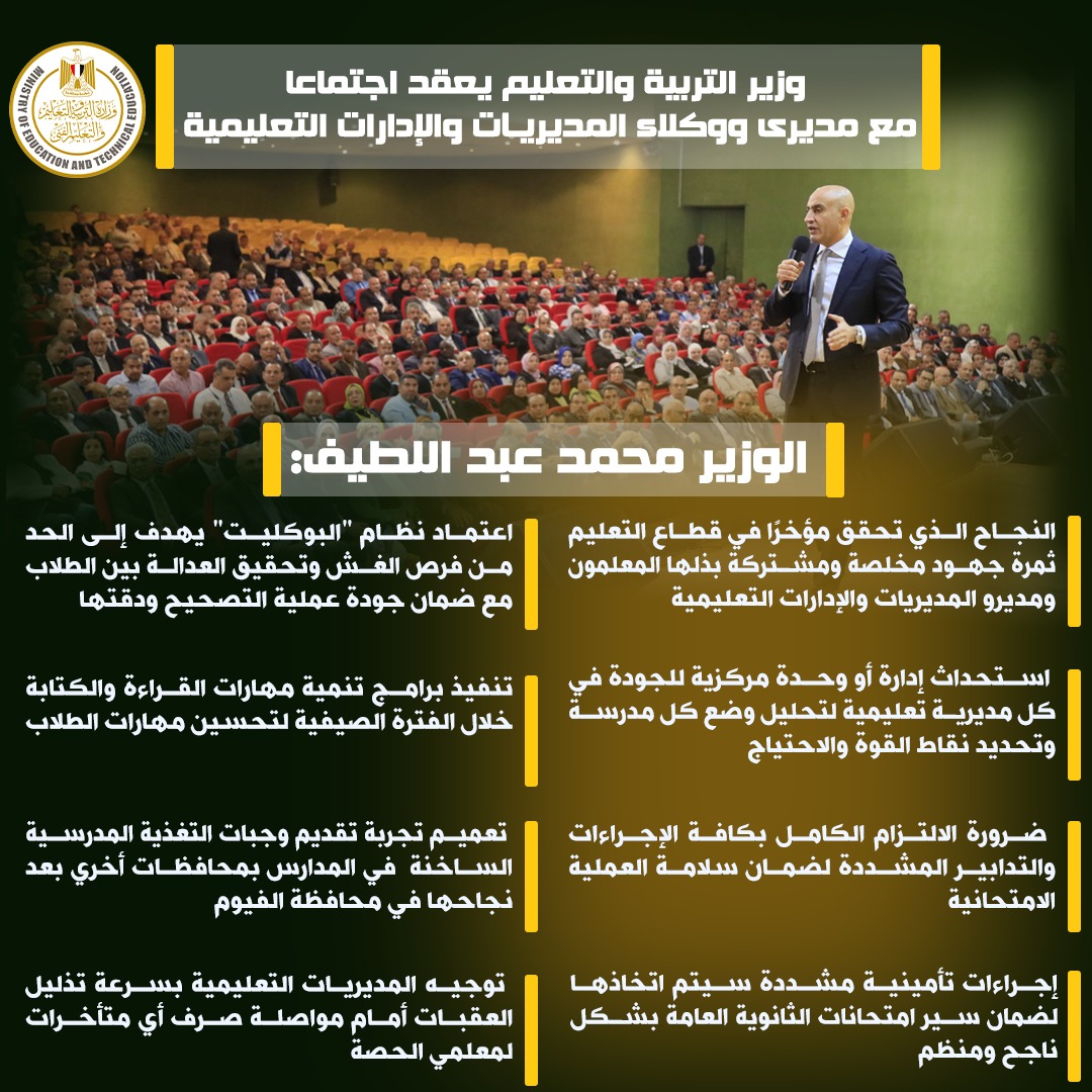 وعقد محمد عبد اللطيف وزير التربية والتعليم والتعليم الفني اجتماعًا مع مديرى ووكلاء المديريات ومديرى ووكلاء الإدارات التعليمية بجميع المحافظات؛ وذلك لمتابعة نتائج انضباط سير العملية التعليمية على مستوى الجمهورية واستعراض الإجراءات التنفيذية والاستعدادات النهائية المتعلقة بامتحانات العام الدراسى الحالى ٢٠٢٤/ ٢٠٢٥، والتأكيد على تنفيذ التعليمات والإجراءات المنظمة للعملية الامتحانية.